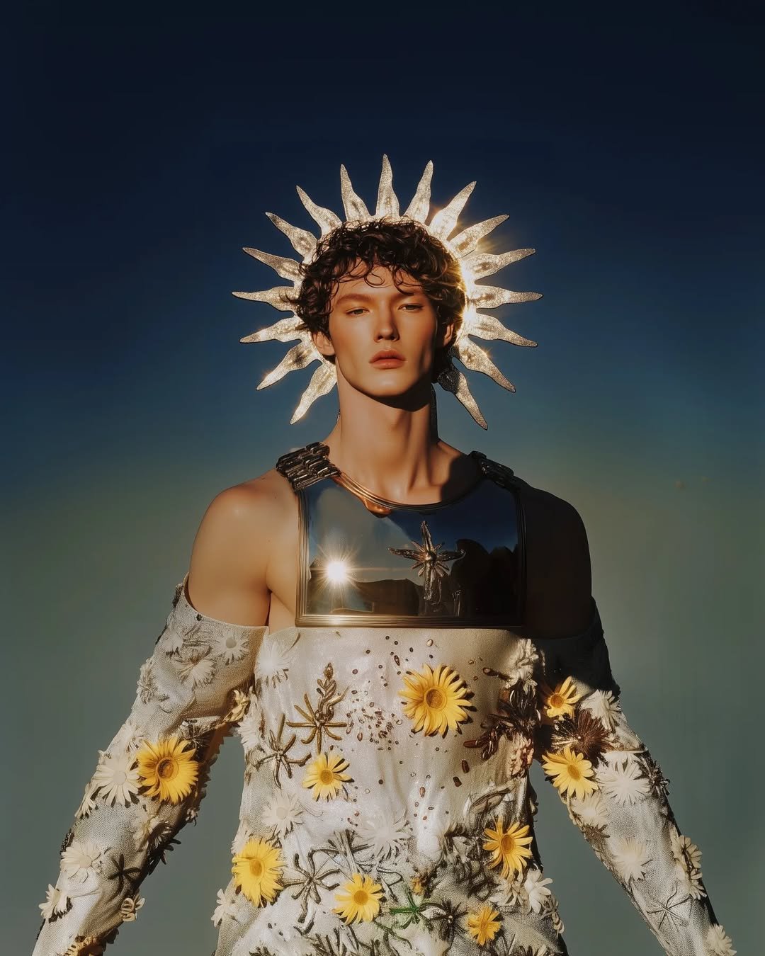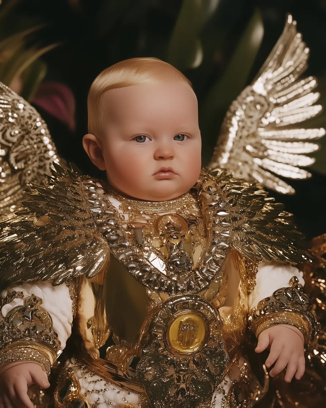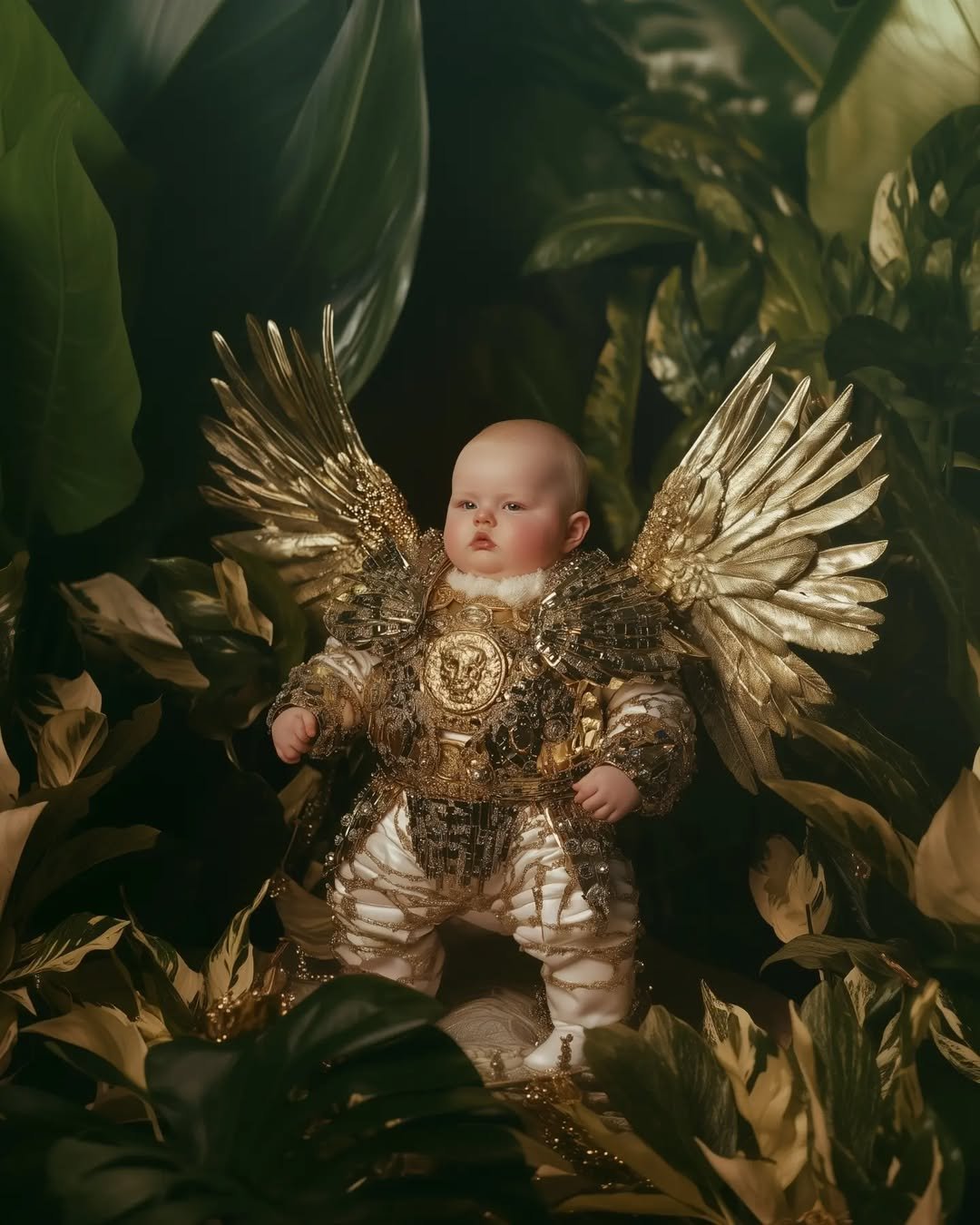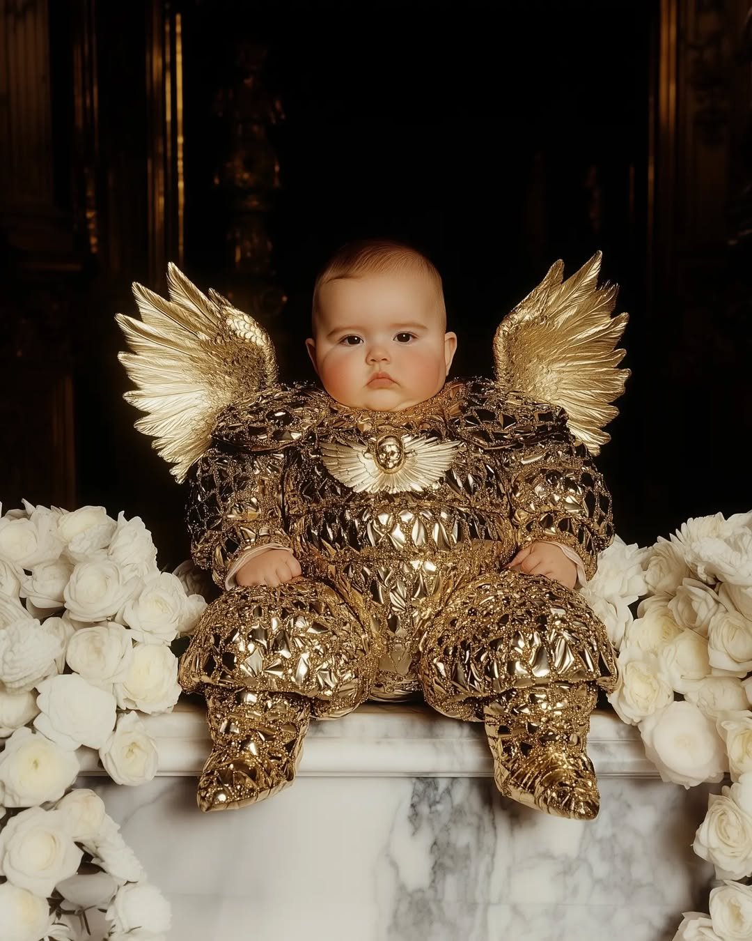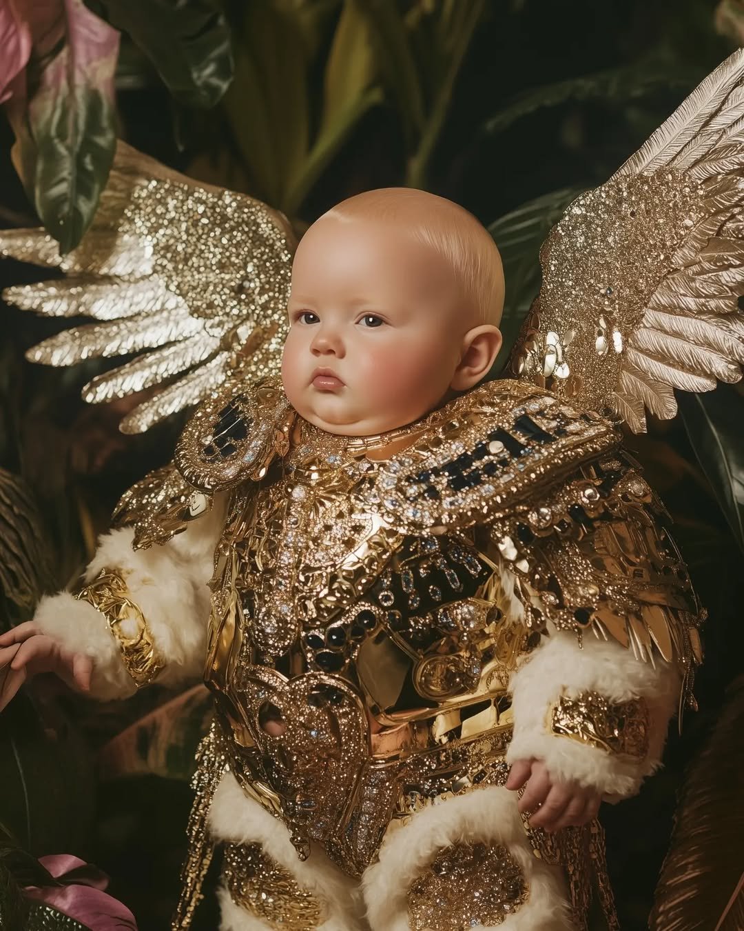 In this selection of her AI artwork, Dani, @analog.fool, a digital creator and lover of fashion, anthropology, and photography, draws inspiration from the opulence of classical Renaissance art. She reimagines sun gods with halos like those of oil-painted saints, gold leaf accents framing the heads of divine figures. Adorable yet fierce baby putti are dressed in glittery armor with golden wings, blending celestial grace with powerful, mythical energy. Historically, armor symbolized protection in battle, strength, status, and divine defense. These putti are anything but delicate—more like badass warriors than soft-skinned, cherubic infants. In a series of imagined headwear for the band KISS, analog.fool taps into the silvery elegance of armor, creating statement pieces with sleek, shiny textures, pointed spikes, and intricate details that scream high fashion.