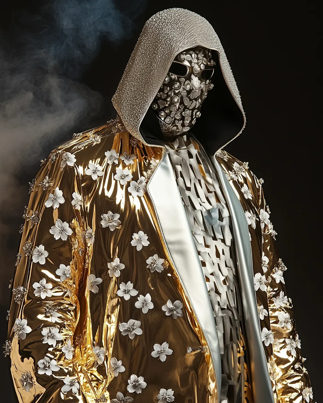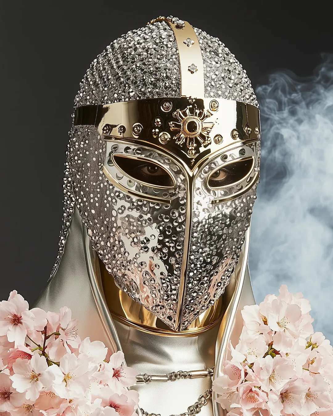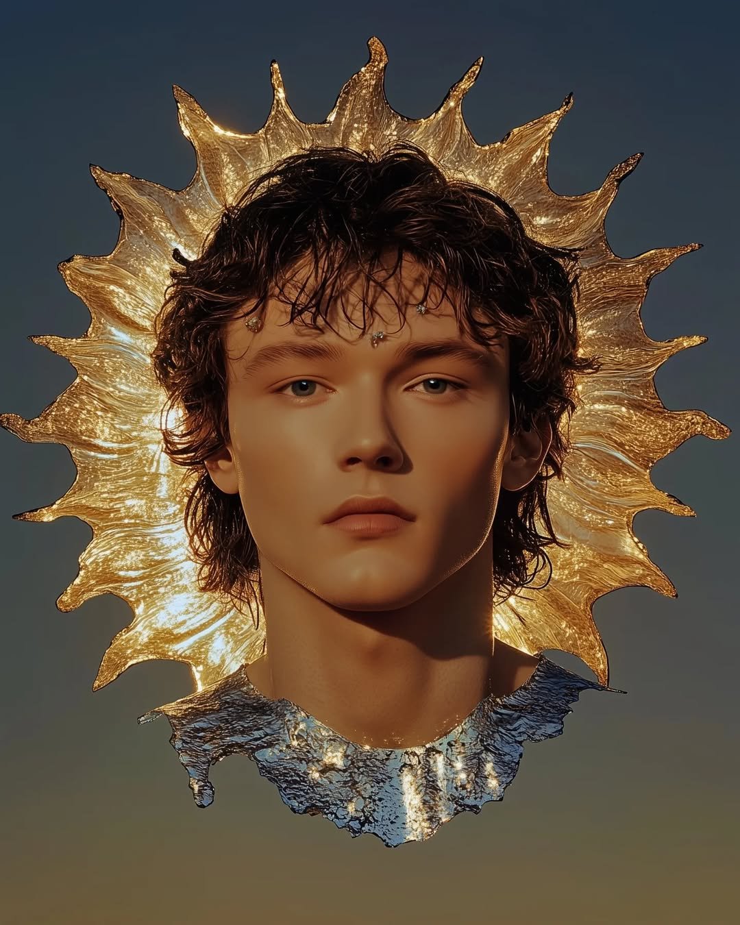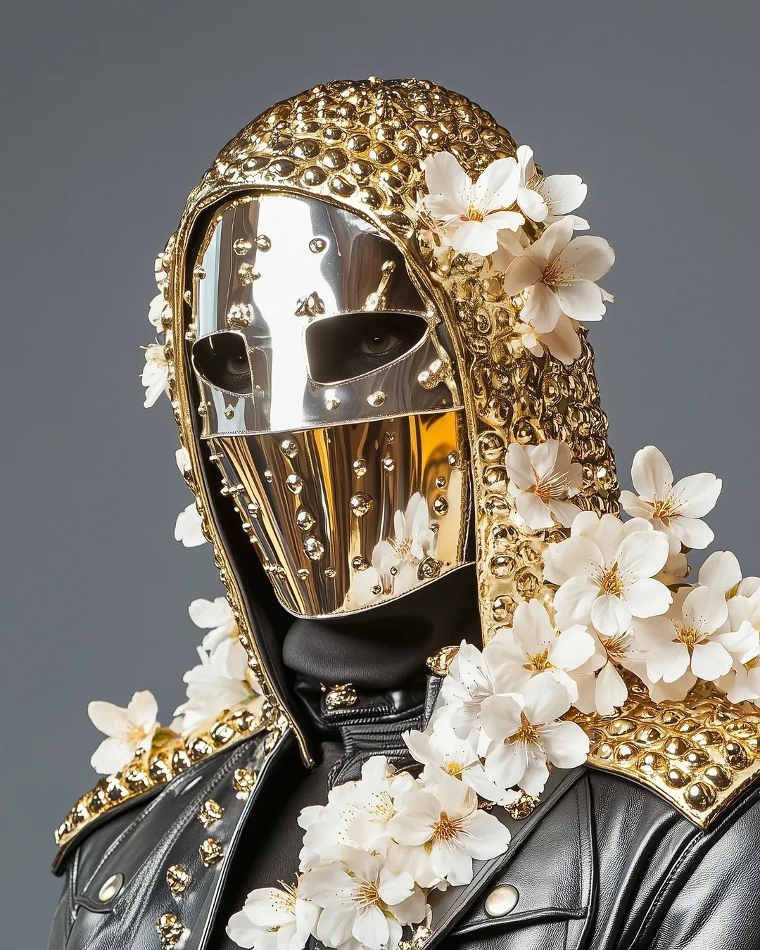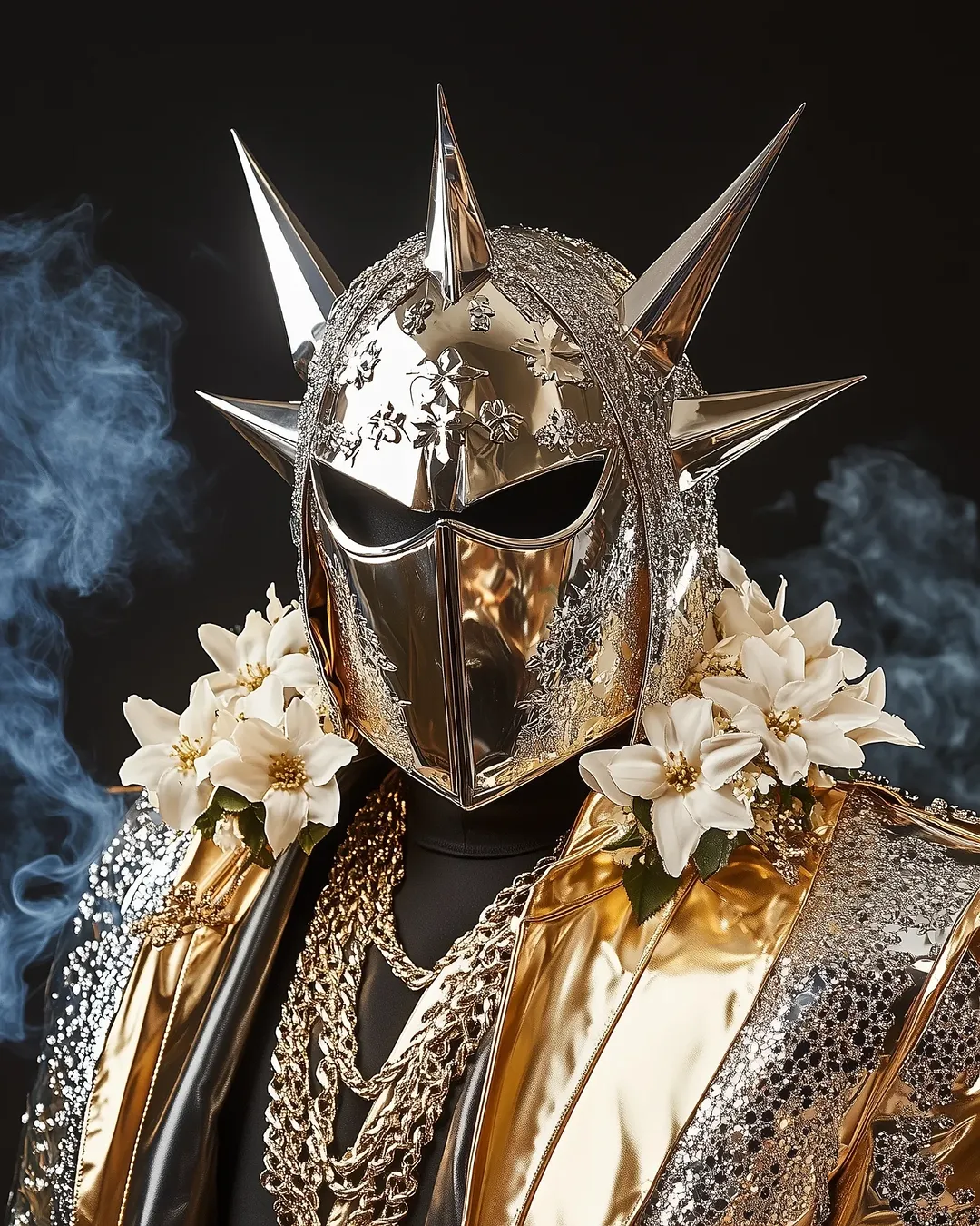 In this selection of her AI artwork, Dani, @analog.fool, a digital creator and lover of fashion, anthropology, and photography, draws inspiration from the opulence of classical Renaissance art. She reimagines sun gods with halos like those of oil-painted saints, gold leaf accents framing the heads of divine figures. Adorable yet fierce baby putti are dressed in glittery armor with golden wings, blending celestial grace with powerful, mythical energy. Historically, armor symbolized protection in battle, strength, status, and divine defense. These putti are anything but delicate—more like badass warriors than soft-skinned, cherubic infants. In a series of imagined headwear for the band KISS, analog.fool taps into the silvery elegance of armor, creating statement pieces with sleek, shiny textures, pointed spikes, and intricate details that scream high fashion.