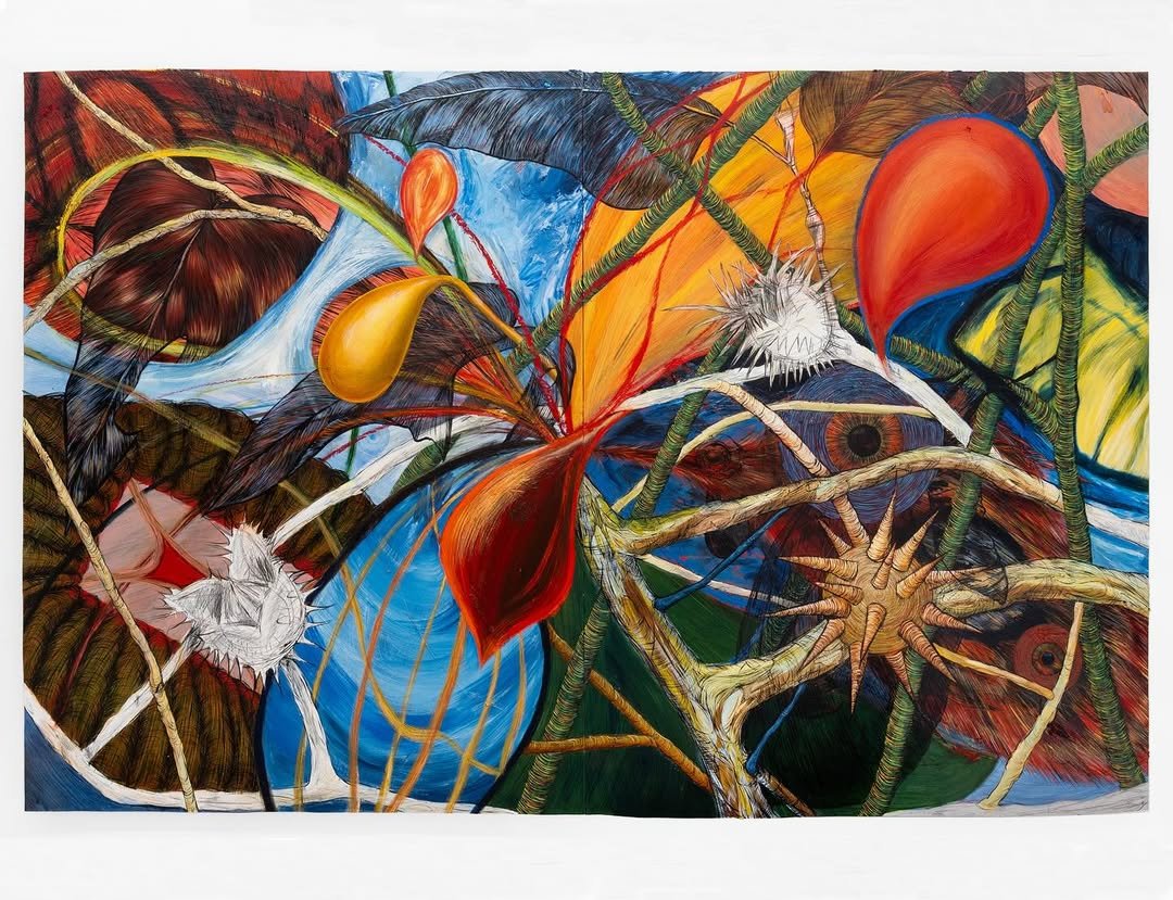 âIn the large new diptych âCrypsisâ, a central butterfly shape lurks behind spiky jimsonweed and a tangle of branch-like tubular structures.
