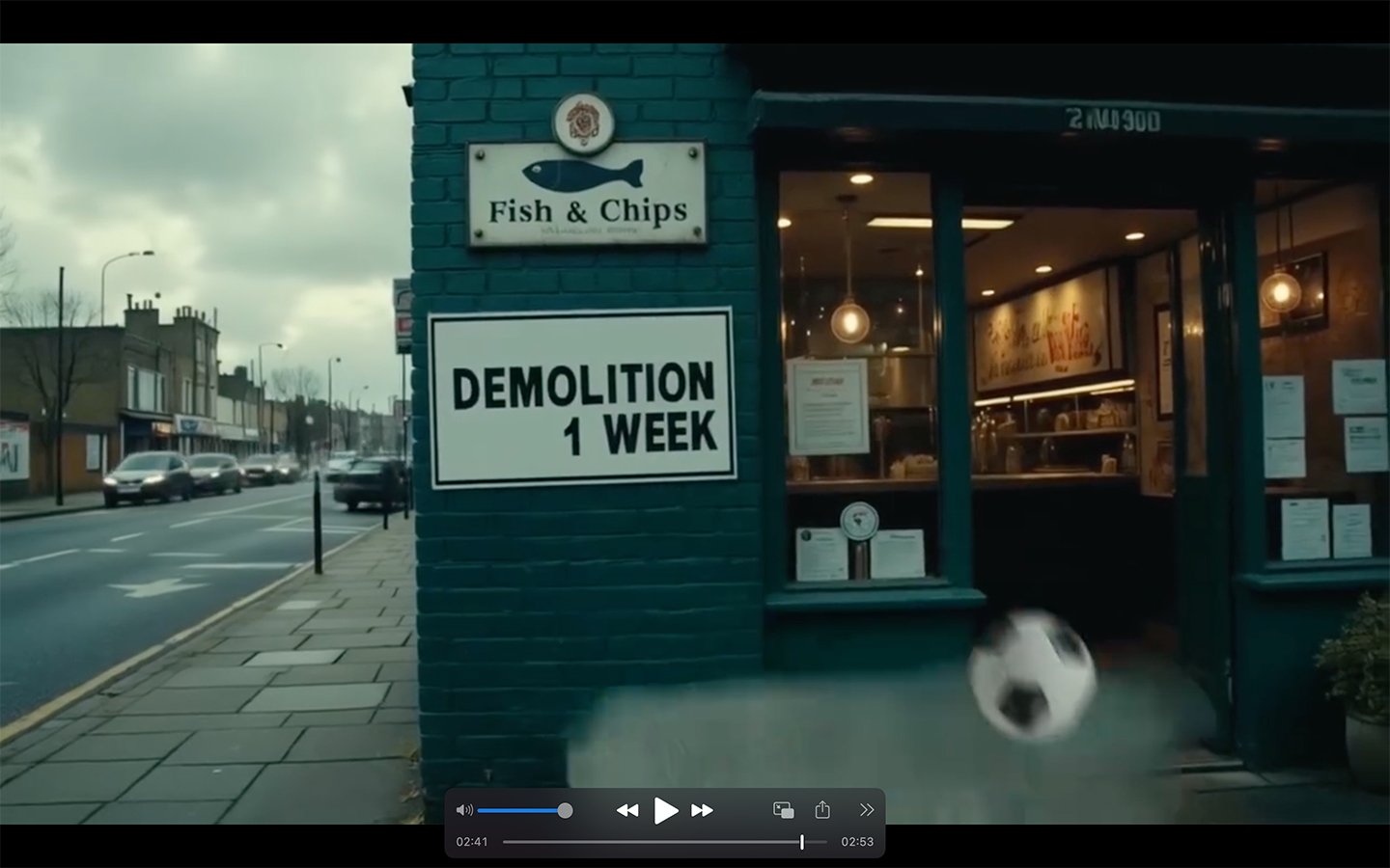 The video ends on a cliffhanger as we eagerly await part 2. Lewis kicks a ball into the notice of redevelopment outside the chippy, which drops to reveal that demolition is set for just one week.