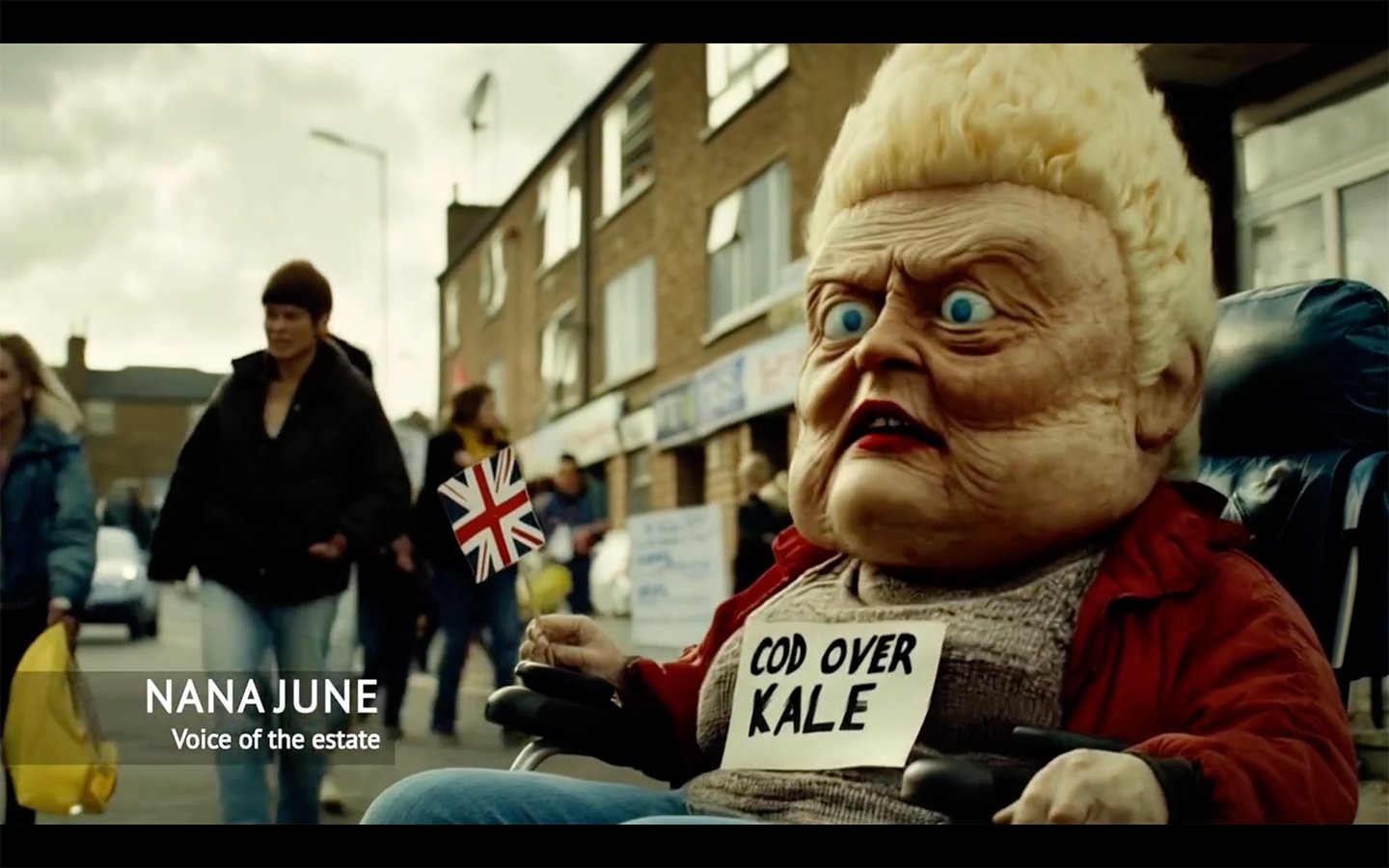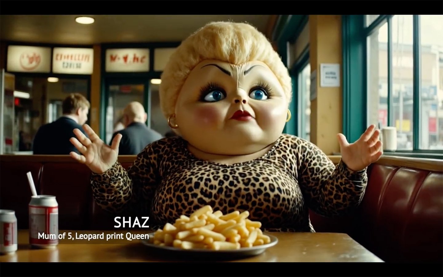 The video is packed with delightful visuals that perfectly match the humor, introducing a series of characters rendered in rit.ai’s signature inflatable style. Big Dave, Keeper of The Fryer, has been running his London chippy for 30 years, but now his beloved shop is being replaced by a vegan bistro. (As a cockroach scuttles across the counter, passing a plate of chips), Big Dave moans, “Something about modernizing the high street. Modernize my ass! What am I supposed to do with all this batter?”