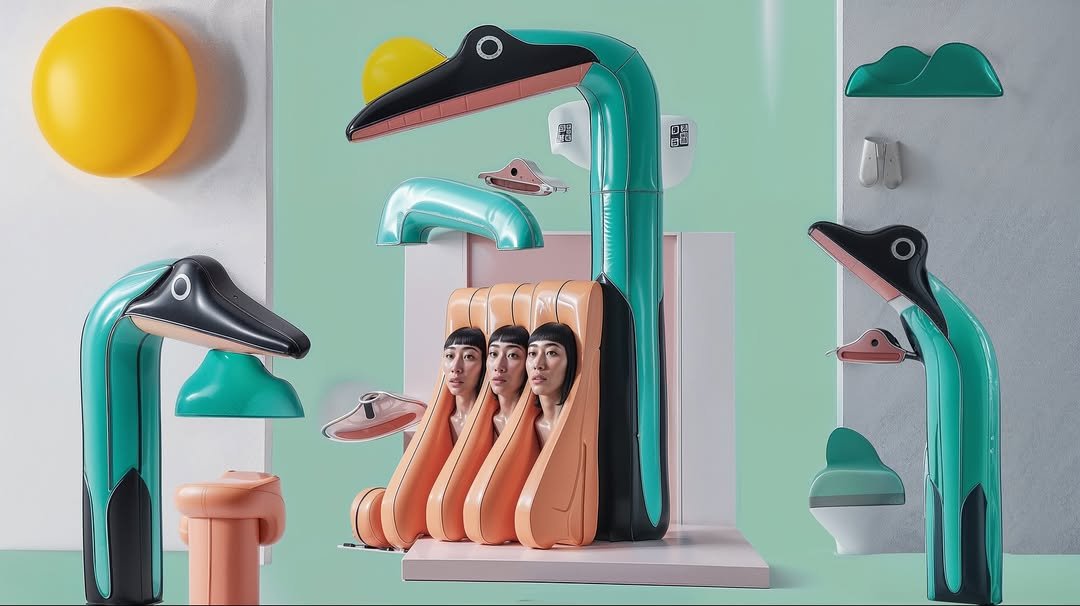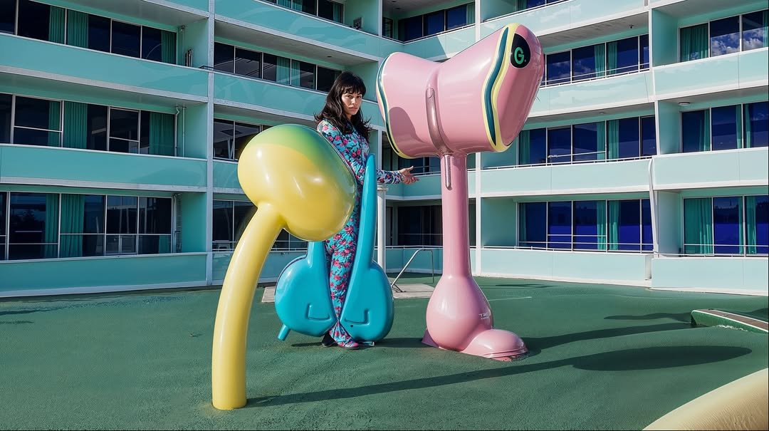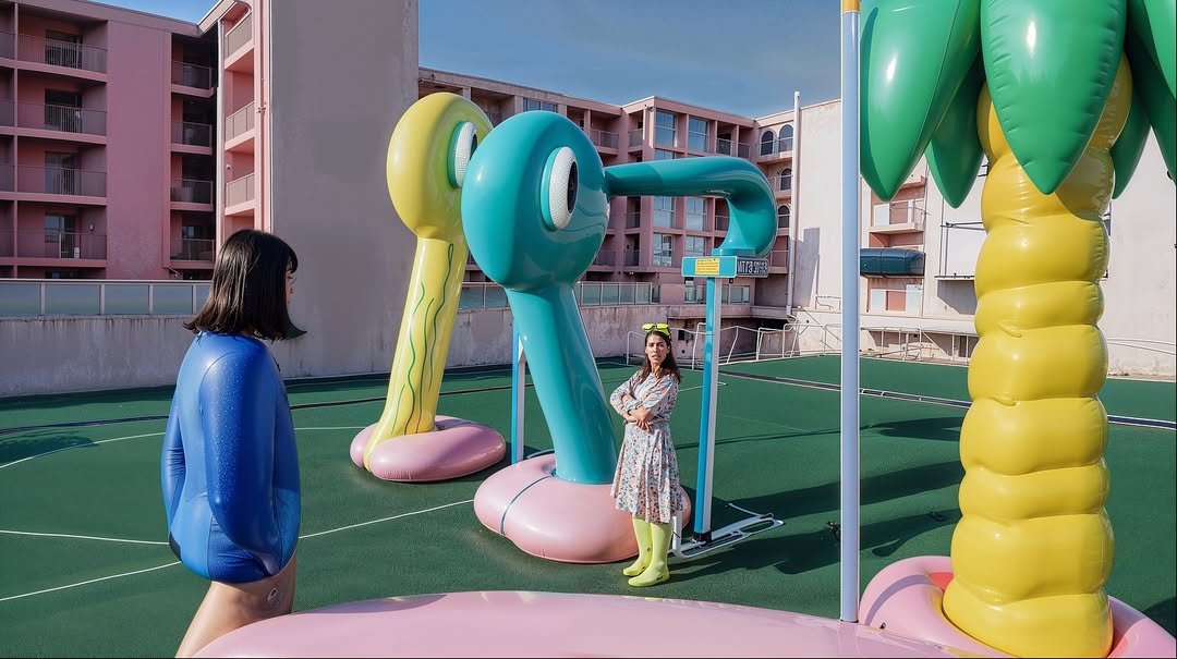 Inflatable figures with exaggerated features in Miami Beach hues engage us, joined by flying pastel dolphins and characters dressed in offbeat, overly-large fashion. Everything is bright, playful, and very entertaining.