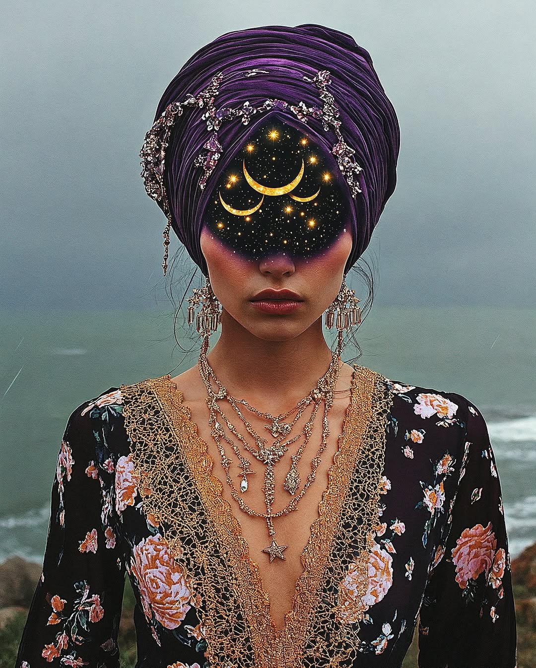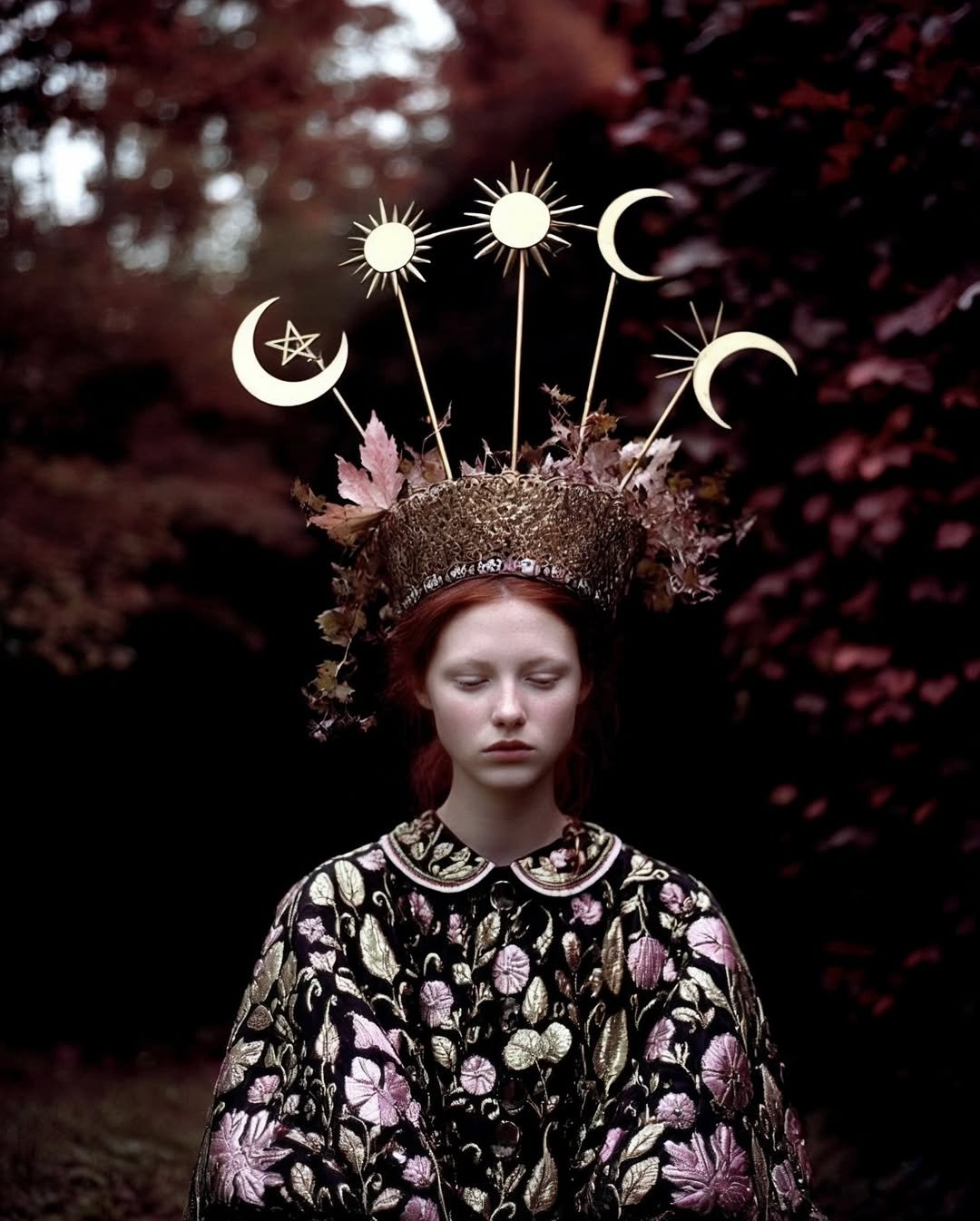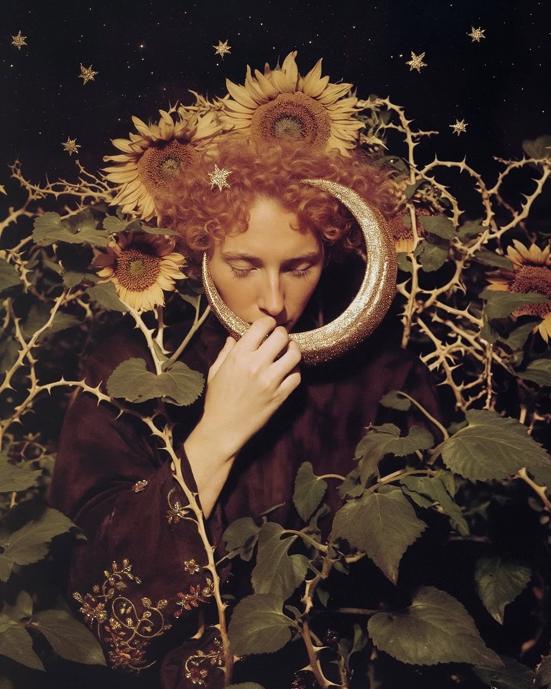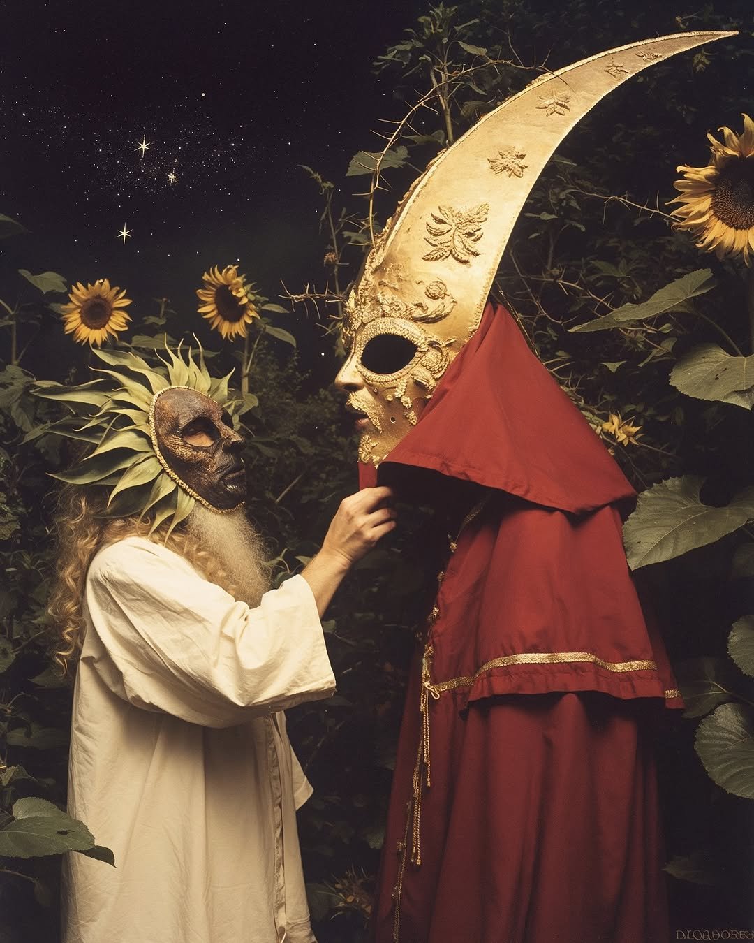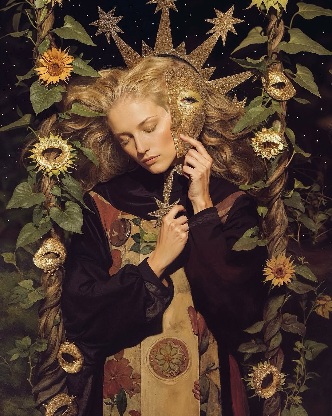 @heks.anda looks skyward through the lens of pagan ritual. Her masked figures and celestial symbols evoke a visual folklore where the sun and moon are not just motifs, but deities. With golden crescents, sunflower crowns, and thistle-choked ceremonies, her work channels the spirit of midsummer rites—somewhere between Goya’s Witches’ Sabbath and the eerie pageantry of The Wicker Man.