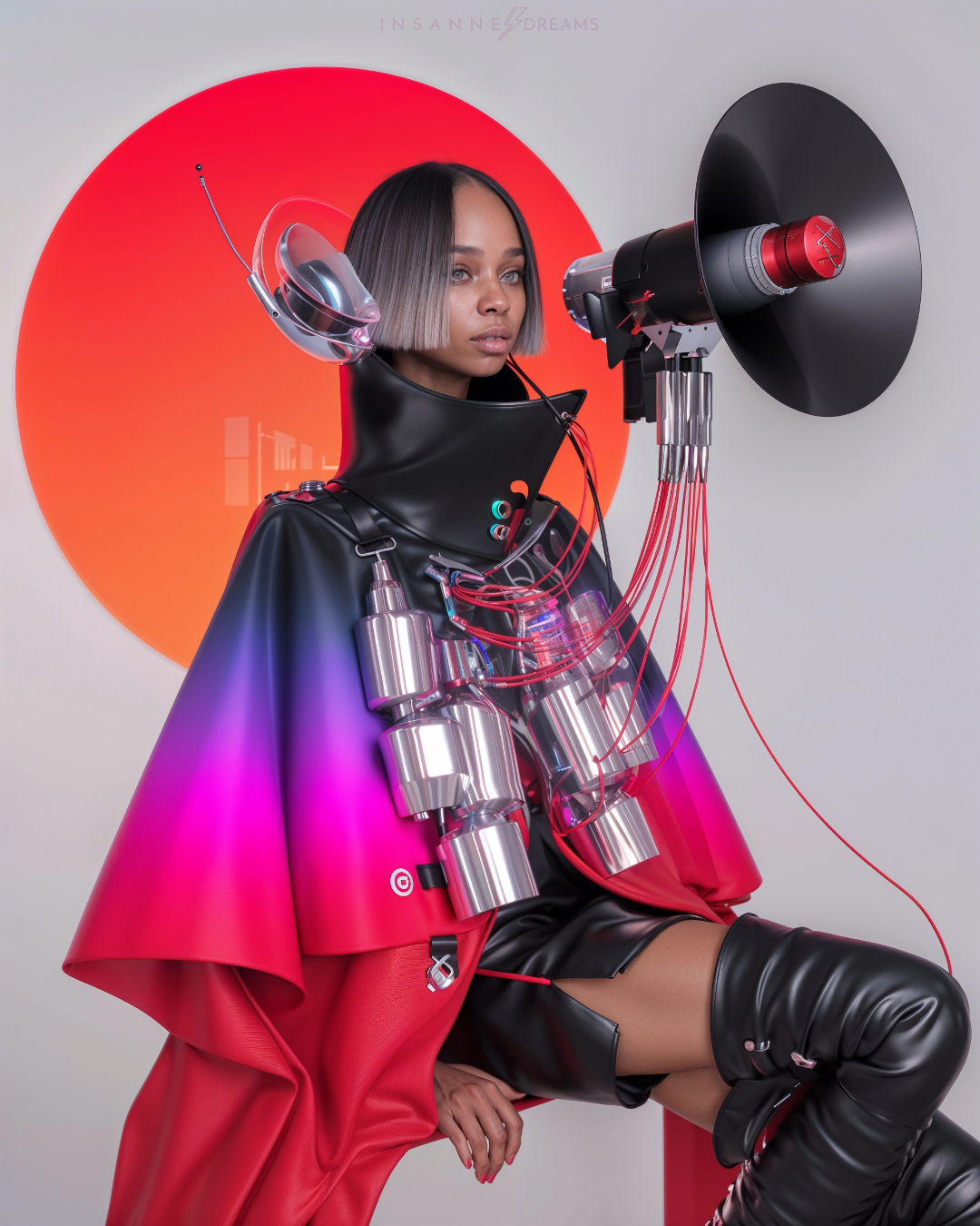Color is incredibly important to my artistic expression. I find myself frequently drawn to the vibrant energy of neon hues. There’s something about the intensity of neon pinks, purples, yellows, and greens that deeply resonates with my visual sensibilities and seems to spark a particular joy in my creative process. While I also utilize the striking contrast of red, black, and white, and the boldness of solid pinks, it’s often the interplay of those electric neon shades that takes center stage in my work. These colors, for me, contribute significantly to the dreamlike and futuristic atmosphere I aim to create, adding a layer of visual excitement and otherworldliness to the surreal scenarios I depict.
