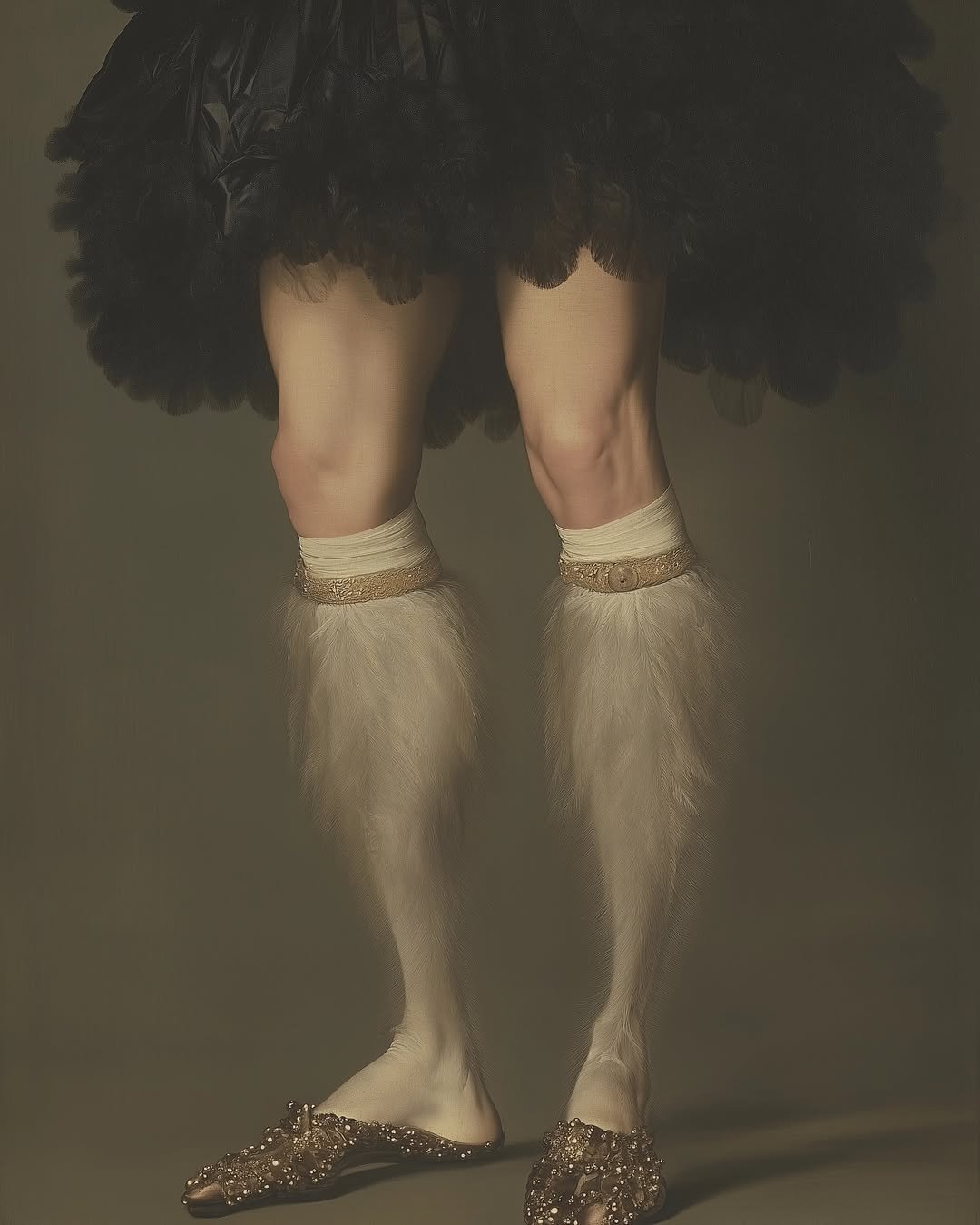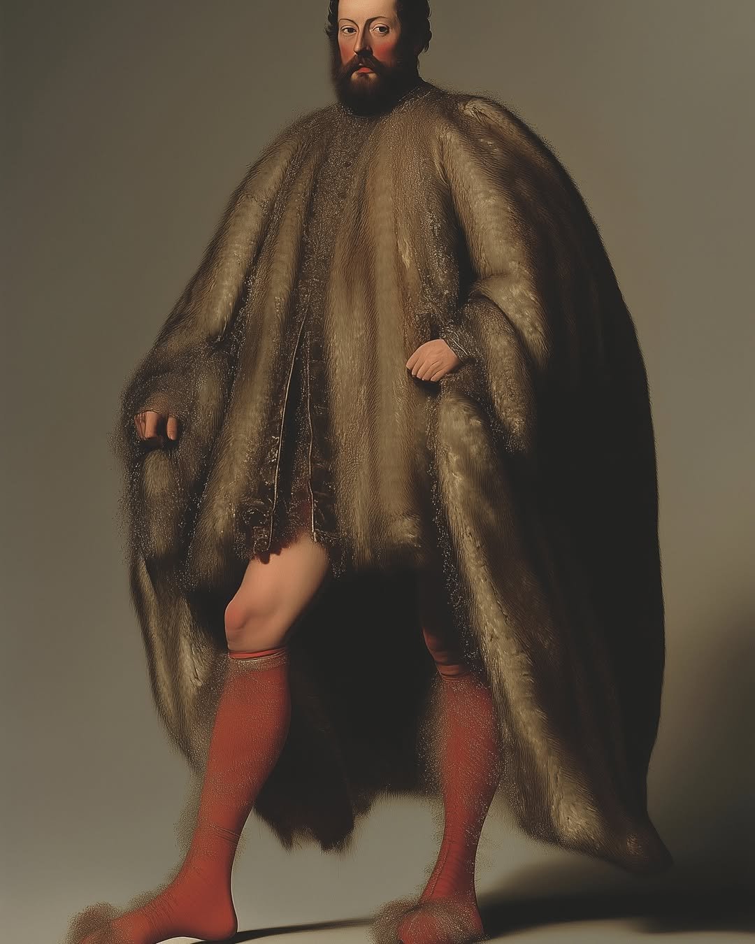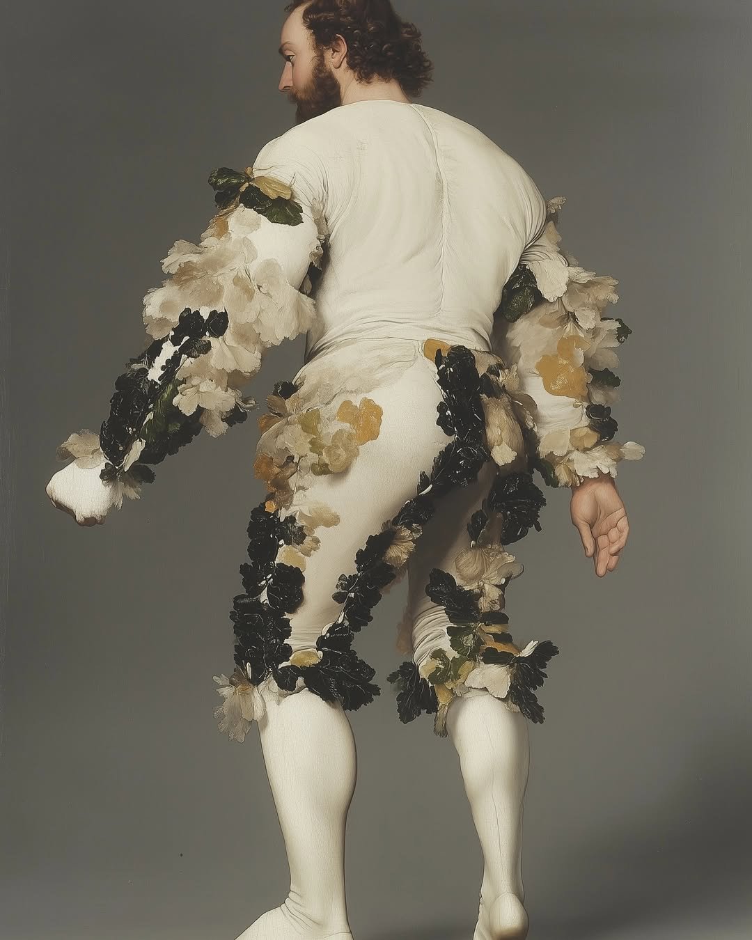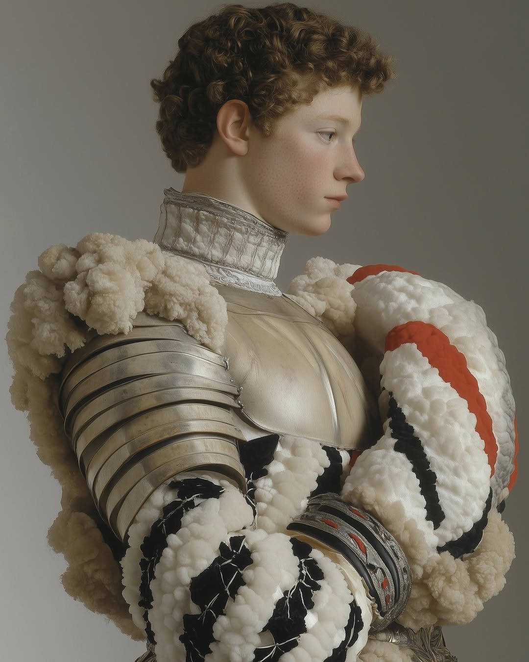 Drawing from the early Northern Renaissance, Kunstkammerai may have found inspiration in Hans Holbein the Younger’s meticulous portrayal of clothing. Close-ups of stockinged legs and backs, draped in surreal, AI-inspired outfits combine classic Renaissance styles with playful, imaginative twists.
