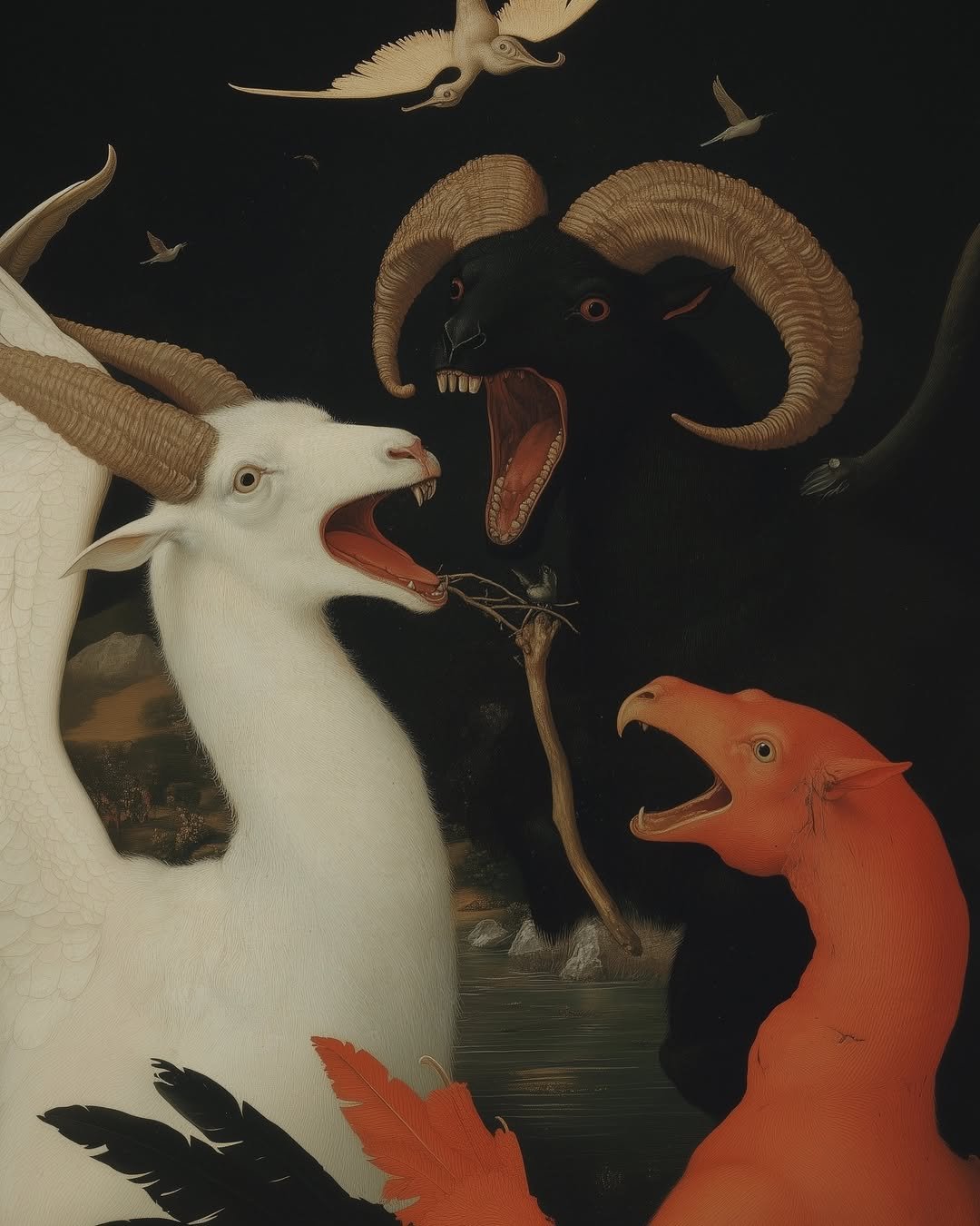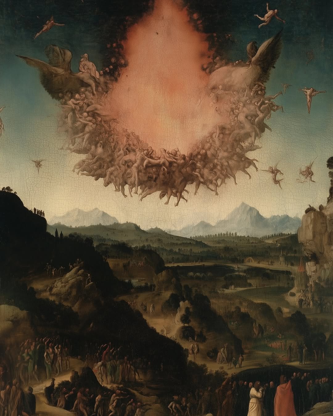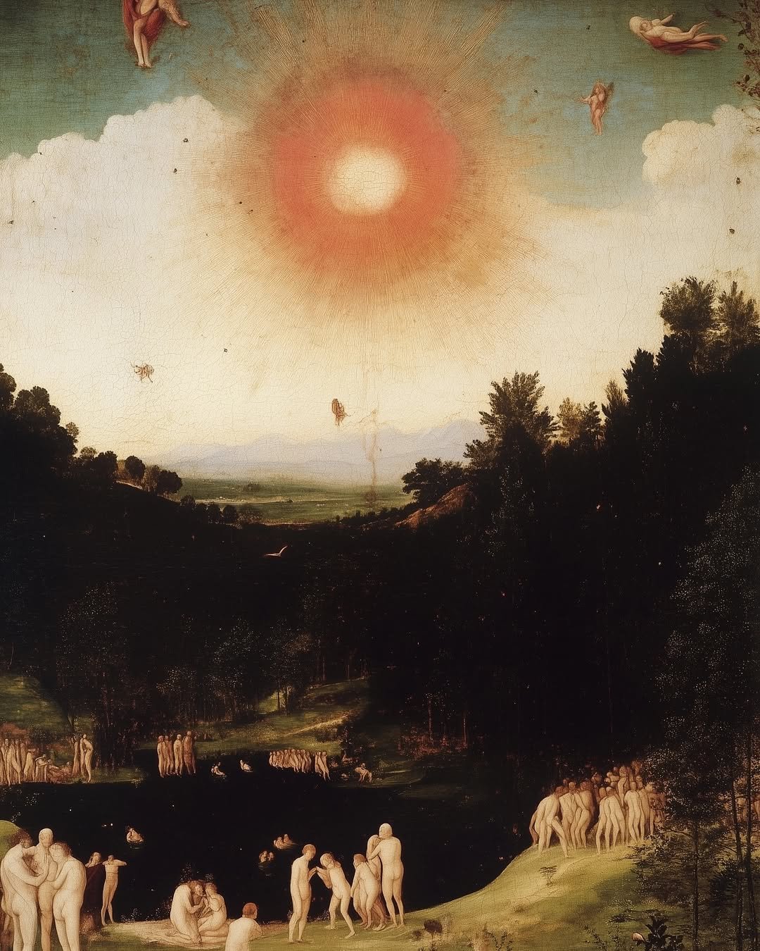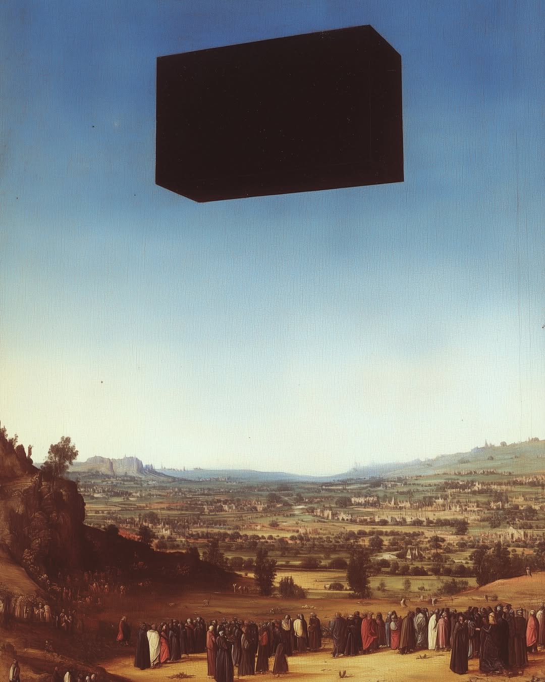Injecting sci-fi into old-world art styles, Kunstkammerai creates a unique mix of the past and future. His AI-driven landscapes channel the detailed scenes of Bosch or Pieter Bruegel the Elder, with a twist—a black alien object or futuristic fireball structures dominate the sky, one moment ablaze, the next spitting out souls. He turns peaceful, pastoral scenes inspired by classical art into otherworldly settings.