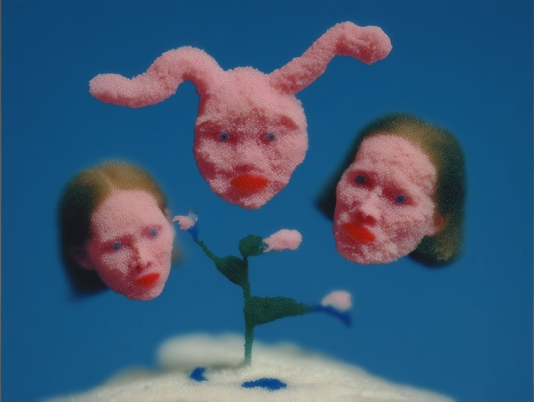 @__mindeye___ ‘s  art feels like an experience you’re not quite sure about, half-remembered, pixelated at the edges, quietly surreal. Her portraits, often of herself, seem to hover in that strange space between presence and disappearance. Faces blur, shift, and dissolve. Nothing is fully clear, and that’s exactly the point. A series inhabited by two floating faces and half-plant creatures drift through soft pastel landscapes of pale pink and blue, with unsettling expressions like childhood toys from another dimension. Playful, but also a little too strange to be comforting. Movement plays are subtle flickers , tiny, looping animations that make her art feel alive, but not in a straightforward way, more like a memory playing back on a glitchy screen.