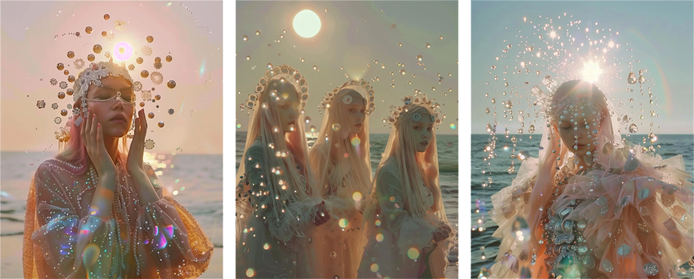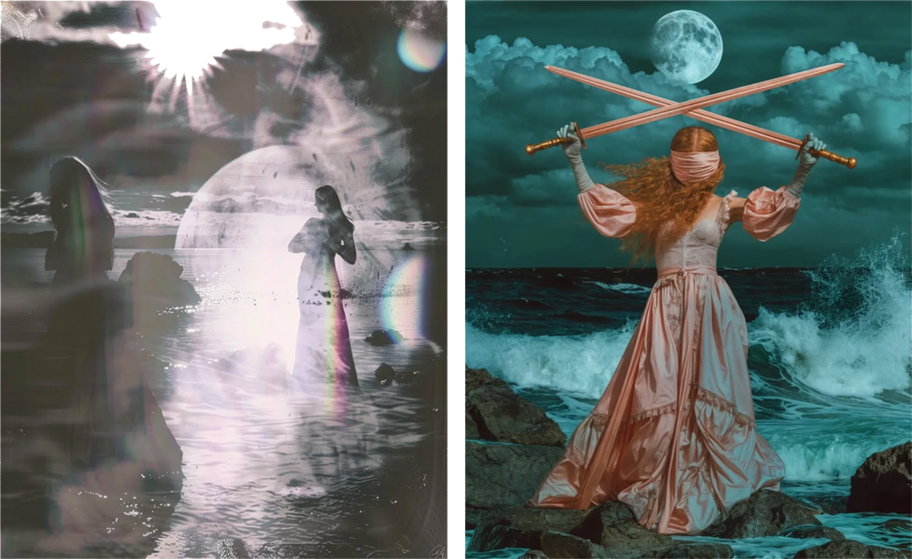 @digitaldollhouse_ai leans into intimacy. Her figures drift through forests and voids, cradling moons or cloaked in stars. Each frame feels quiet, theatrical, and surreal—somewhere between Icarus and a vintage editorial shoot. The sky here isn’t vast. It’s soft, symbolic, and close to the skin.