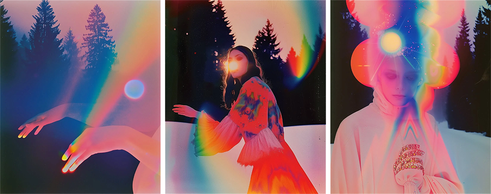 @tamsy.land filters the heavens through neuroaesthetic glow. Her figures radiate light and color, floating in fields of gradients and soft forms. Influenced by pattern and emotional response, her process—“ai-deating”—blends visual care with self-care. Her stars soothe. Her suns don’t burn—they shimmer.