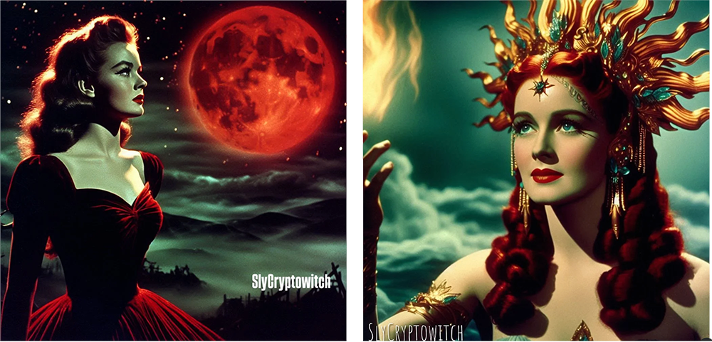 And then there’s @SlyCryptowitch. Her fascination lies in the moon—and in the moods of midnight cinema. Drawing from 1960s pop culture and retro witchcraft aesthetics, her work is pure spectacle: glamorous witches, crimson skies, and eerie moons that feel lifted from B-movie lore. Unlike the other artists’ quiet reverence or folk mysticism, hers is knowingly theatrical—where the cosmos becomes a stage for fantasy, fear, and feminine myth.
