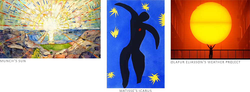 The sky in visual art often feels less like a setting and more like a mirror—one that reflects emotion. Van Gogh’s swirling night isn’t really about stars—it’s about restlessness and wonder. Olafur Eliasson’s Weather Project brought the sun indoors, transforming a museum into a glowing, mirrored space of reflection—both literal and psychological. Munch’s Sun blazes with something sacred. Matisse’s Icarus floats in endless blue, pierced by stars. Not just falling, but reaching—too far, perhaps.