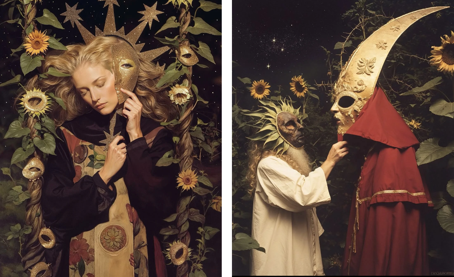 @heks.anda looks skyward through the lens of pagan ritual. Her masked figures and celestial symbols evoke a visual folklore where the sun and moon are not just motifs, but deities. With golden crescents, sunflower crowns, and thistle-choked ceremonies, her work channels the spirit of midsummer rites—somewhere between Goya’s Witches’ Sabbath and the eerie pageantry of The Wicker Man.
