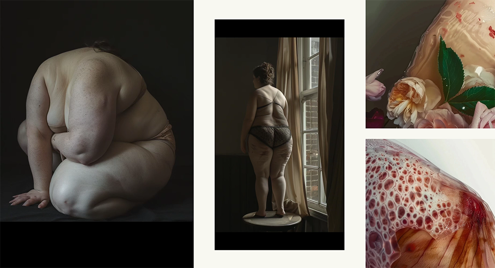Some of the work gets up close to bodies and skin, drawing attention to pores, wrinkles, scars, and stretches, while others take a more abstract or surreal approach to how the body is seen and felt. Skin becomes more than just something that covers us. It turns into a place where identity, beauty, and even discomfort live side by side. The use of AI allows these images to hover between the familiar and the uncanny. There’s a raw honesty in how these artists approach the body. They don’t try to smooth things over or chase perfect forms. Instead, they focus on textures, marks, surface patterns and and the so-called flaws that make us real. It brings to mind photographer Nan Goldin, whose work has long revealed the beauty in vulnerability and imperfection. Like her, these artists invite us to look closely, to sit with the discomfort, and to find a different kind of truth in our physical bodies.