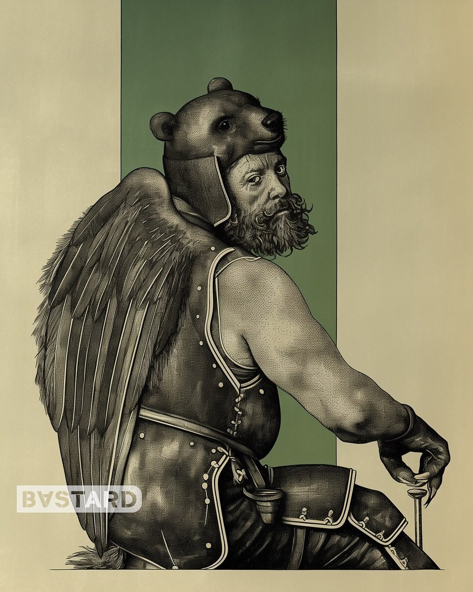 bvstard.ai, a London-based artist, created these two series, Colophon and Fairy Tales, drawing inspiration from the likes of Albrecht Dürer’s medieval woodcuts, blending bearded men and bestiary creatures with modern graphic aesthetics.