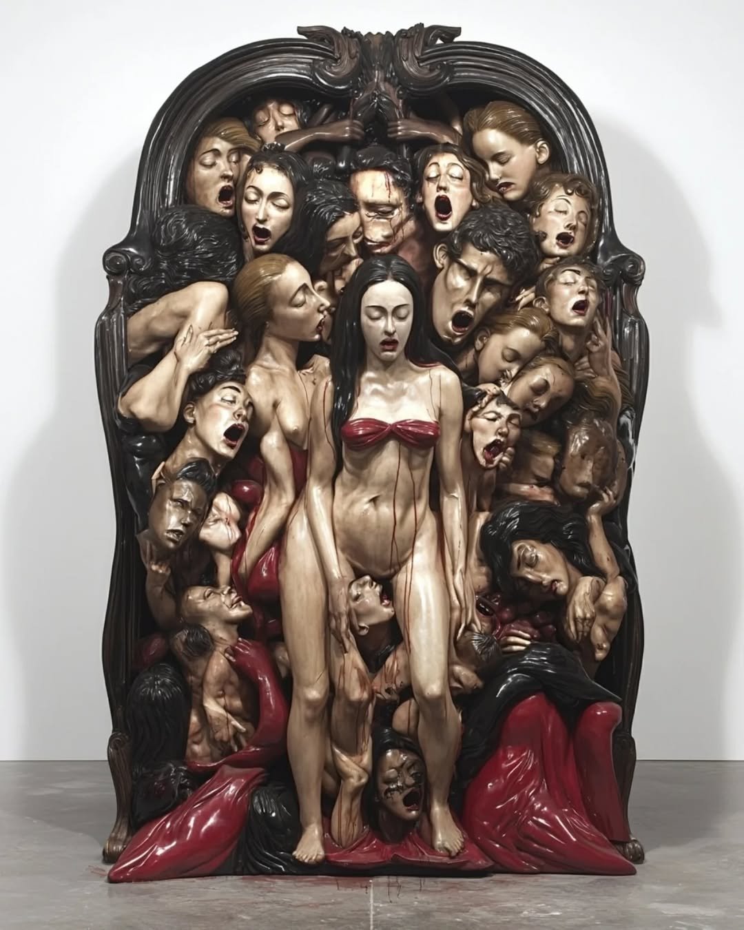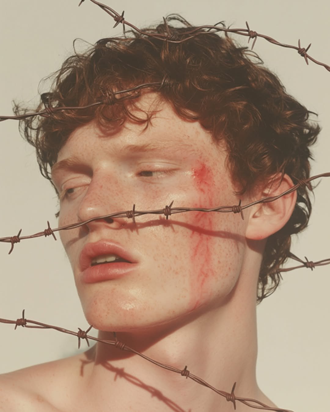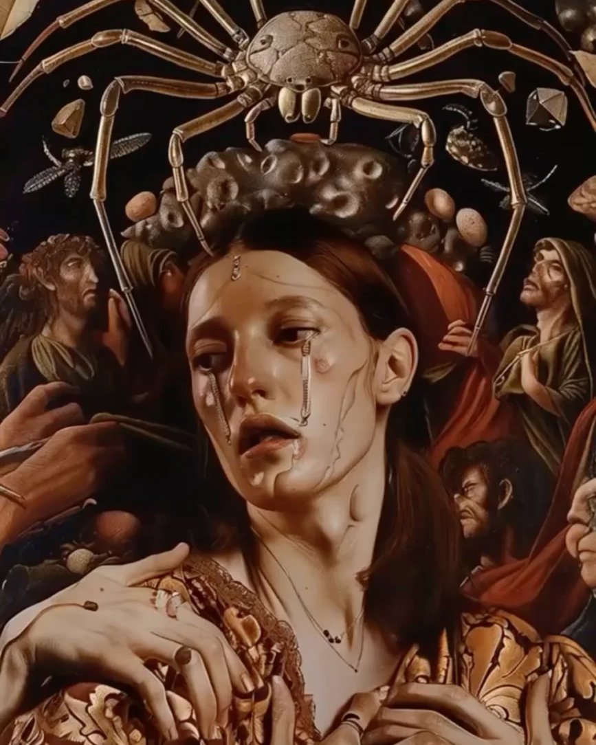 An AI-generated diptych (above) by damn.ait of a male face obscured by barbed wire evokes the suffering and sacrifice seen in Renaissance art, particularly in the works of artists like Matthias Grünewald, whose Isenheim Altarpiece depicts Christ’s agonizing passion. The barbed wire symbolizes a modern reinterpretation of Christ’s or all human torment, suggesting contemporary feelings of alienation.