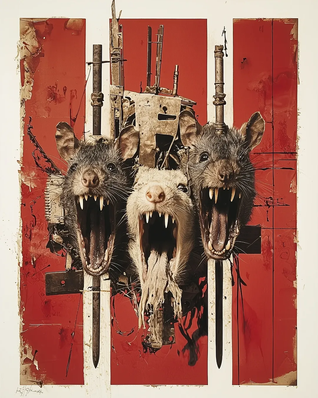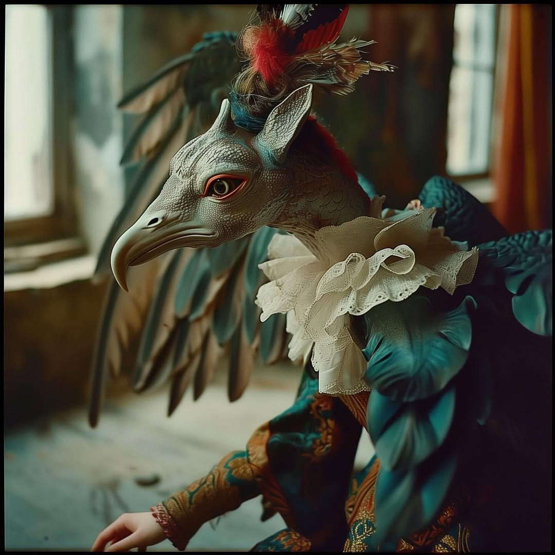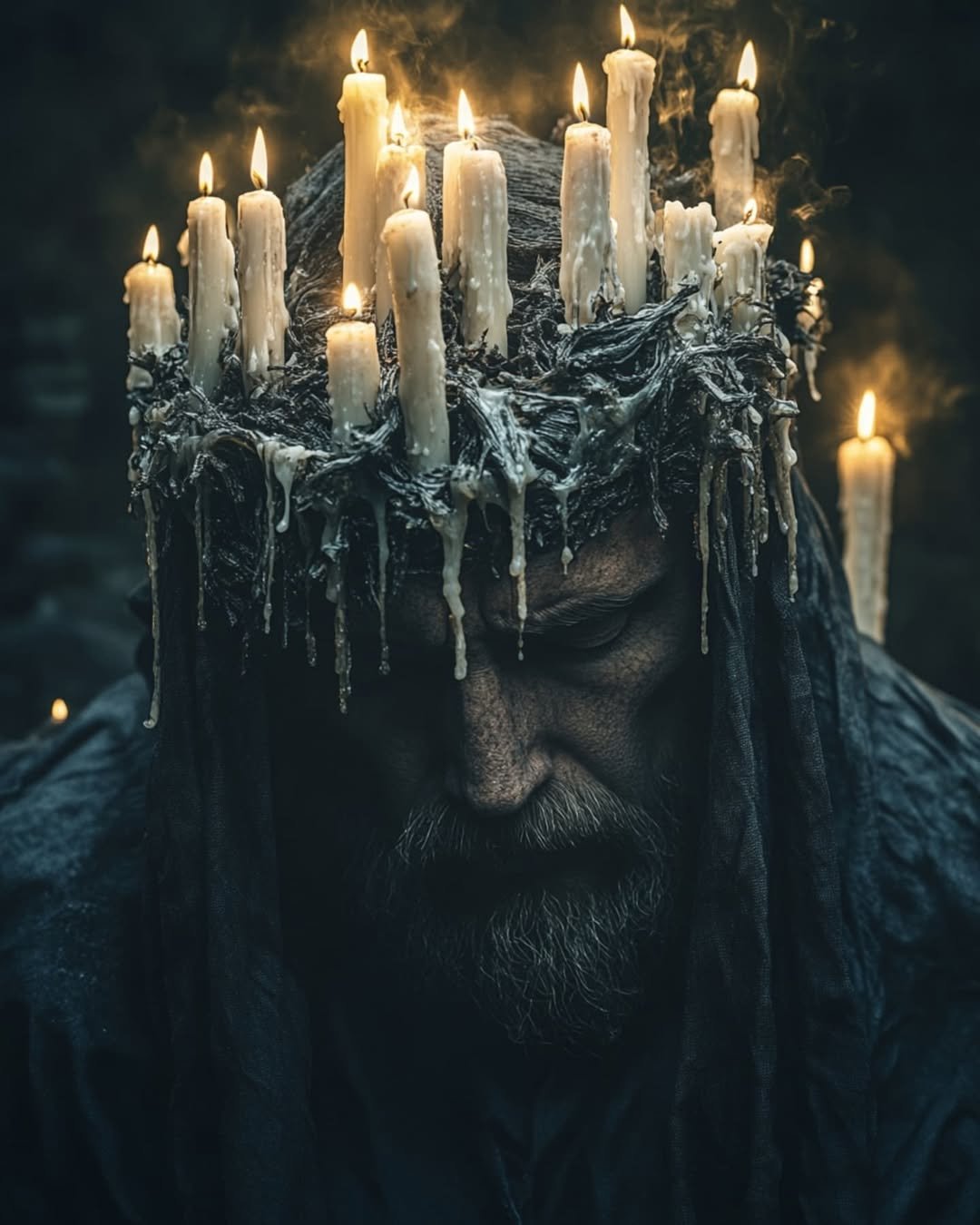 An AI-generated diptych (above) by damn.ait of a male face obscured by barbed wire evokes the suffering and sacrifice seen in Renaissance art, particularly in the works of artists like Matthias Grünewald, whose Isenheim Altarpiece depicts Christ’s agonizing passion. The barbed wire symbolizes a modern reinterpretation of Christ’s or all human torment, suggesting contemporary feelings of alienation.