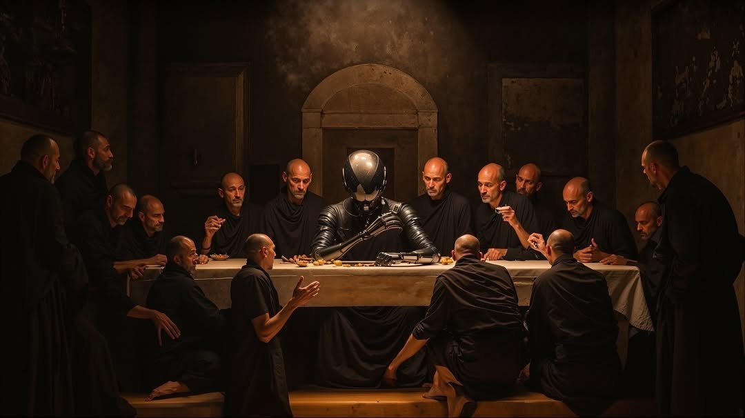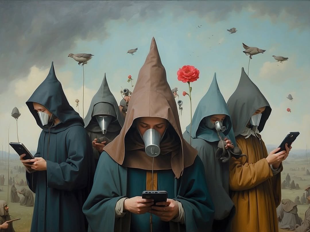 The Last Supper in Renaissance art reflected spiritual devotion, while plague masks served as a stark reminder of the devastation of disease. In these two humorous images, the Christ figure is replaced with a robotic spaceman. The figures in the second image are more focused on their devices than on fear of death, highlighting  a modern detachment from the medieval concerns of life and death.