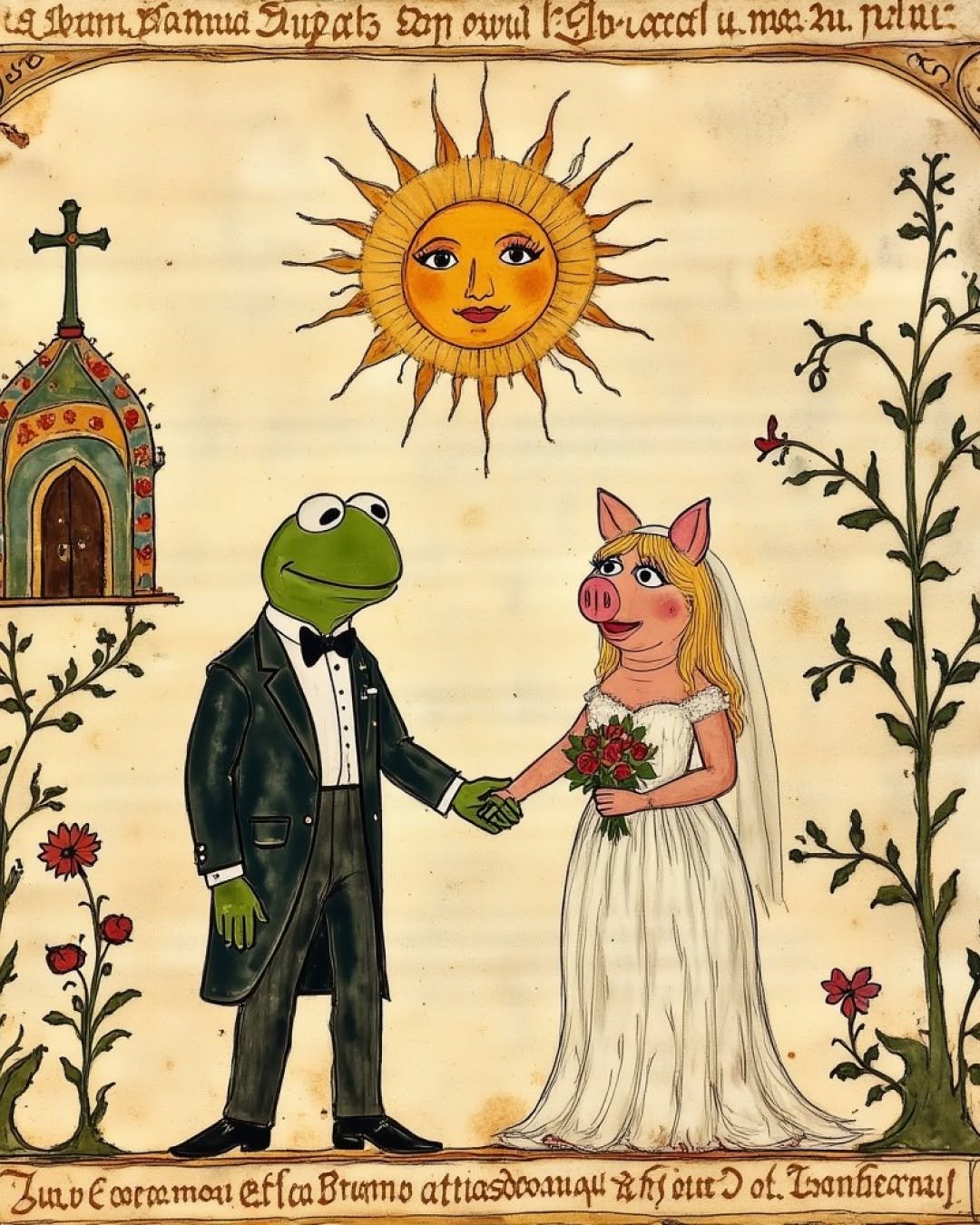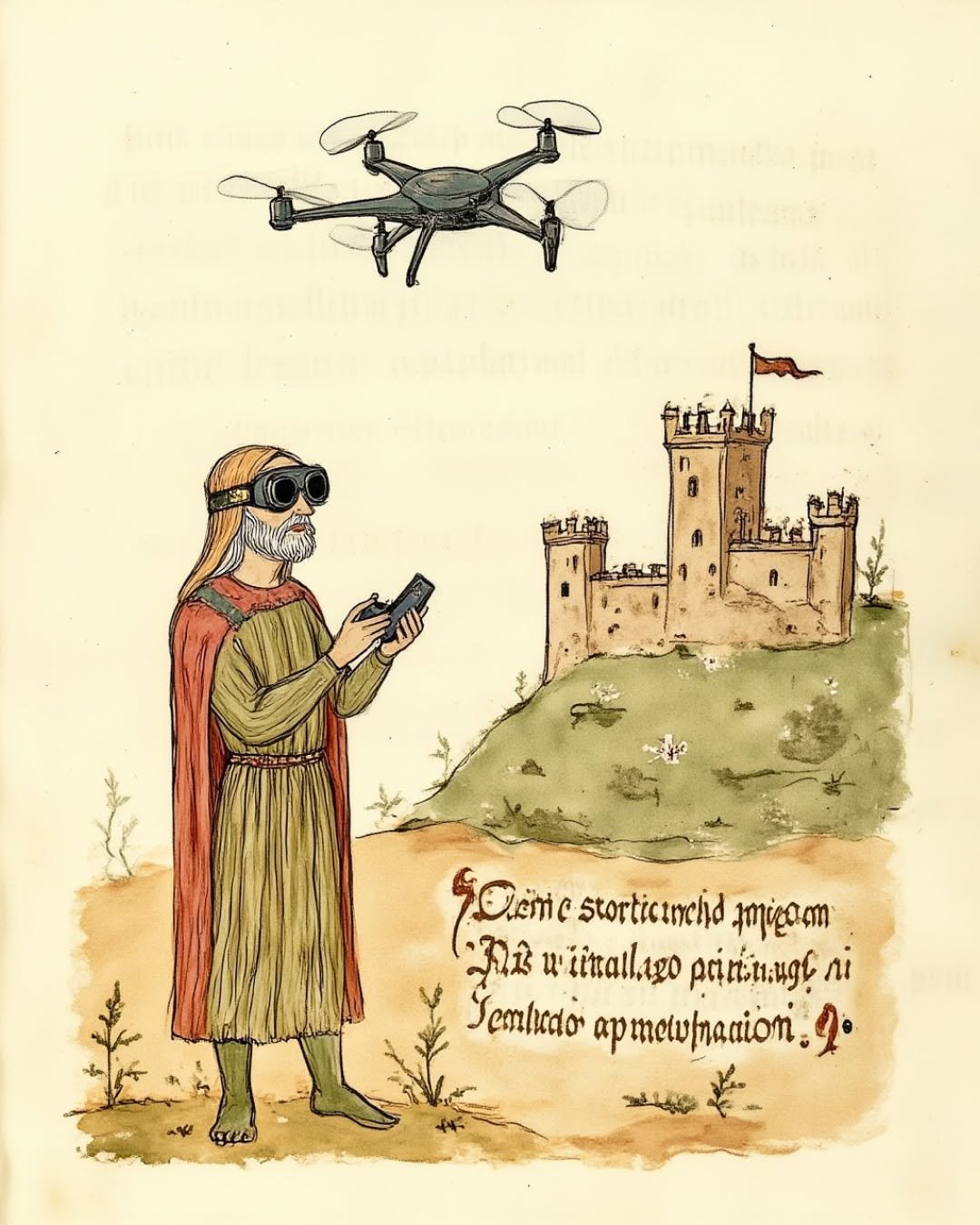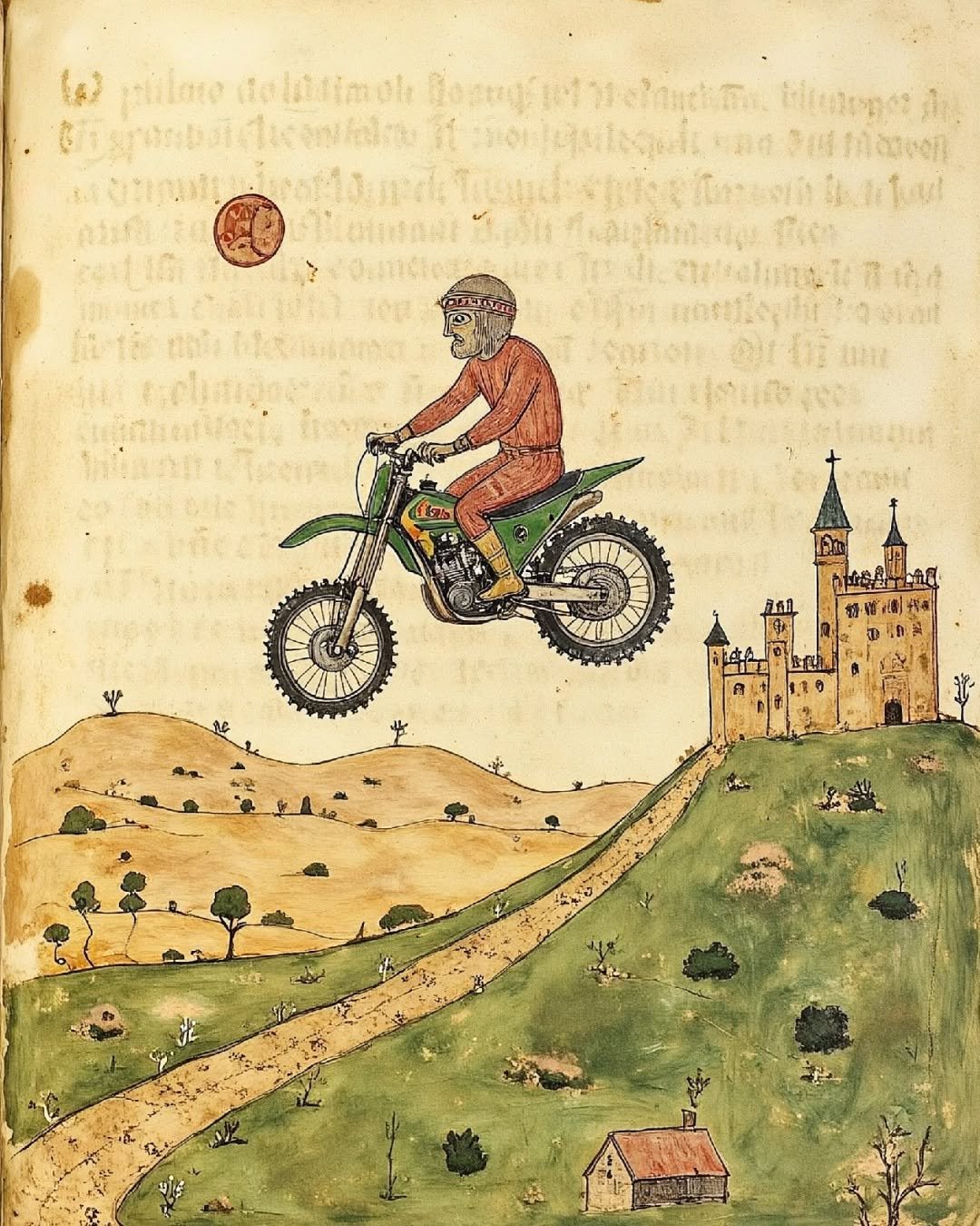 The next two examples showcase more typical uses of AI tools for image generation. In the top row, we see humorous images created in a style known as medieval manuscript, generated for flux and linked via an account that shares ai news and education, hellocivitai. In the lower row, a fan of medieval, graphical fantasy RPG content, richo.ai shares realistic and very well-crafted images created with Midjourney. However these examples do not necessarily represent “art” for me, seeming to lack a subjective interpretation or deeper meanings from the creators