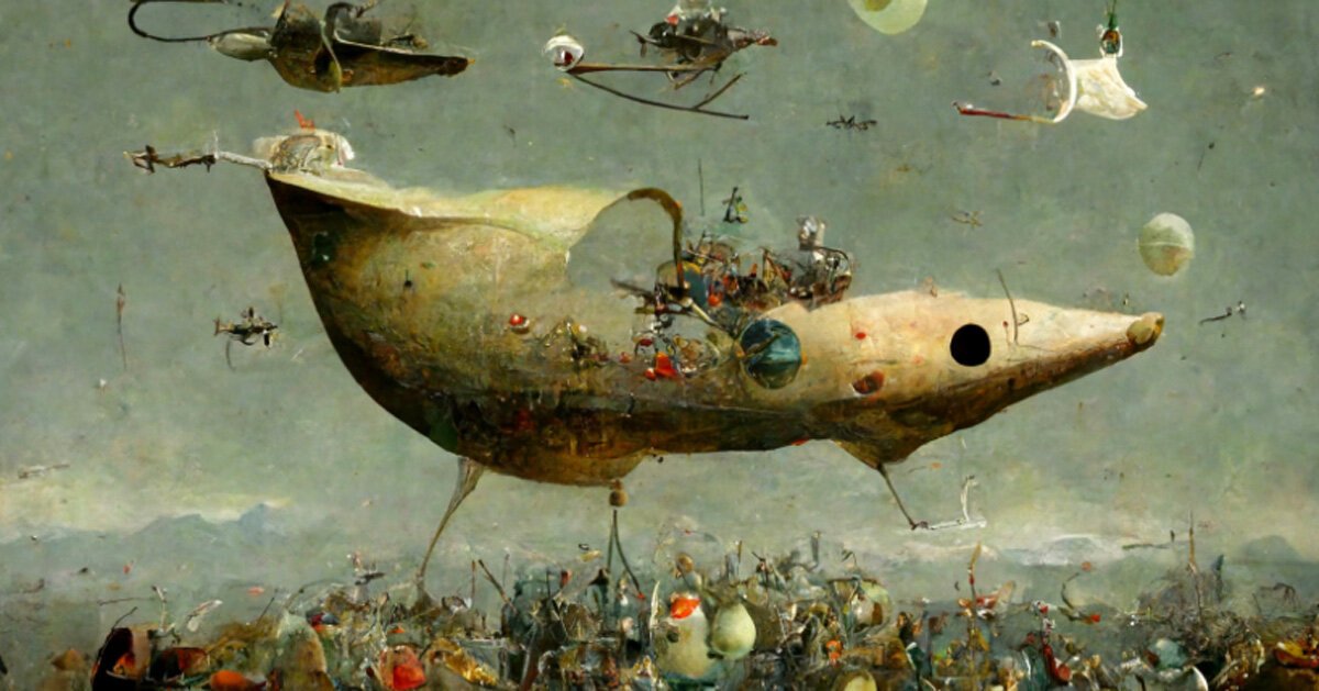 This week, we’ll focus on AI art that explores altered histories from late medieval to early Renaissance art. Let’s start with Carla Gannis’ 2014 large-scale digital artwork, Garden of Emoji Delights, which incorporates emojis and gifs and served as a precursor to the kind of art ai is capable of producing today, blending historical references with contemporary digital symbols. Filippo Nassetti used early AI art tools to place spaceships into the painted worlds of Bosch and Caravaggio, in 2022.