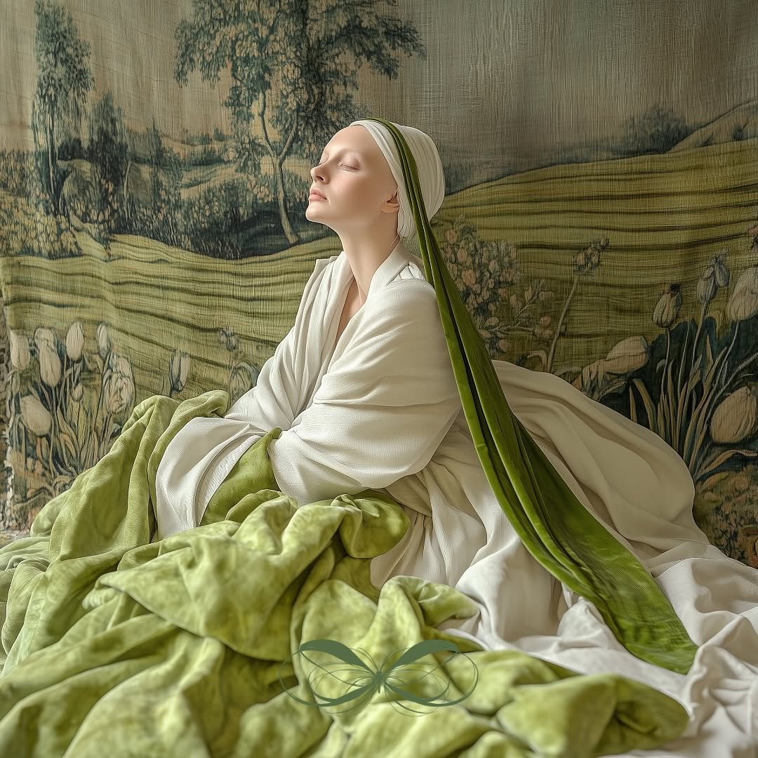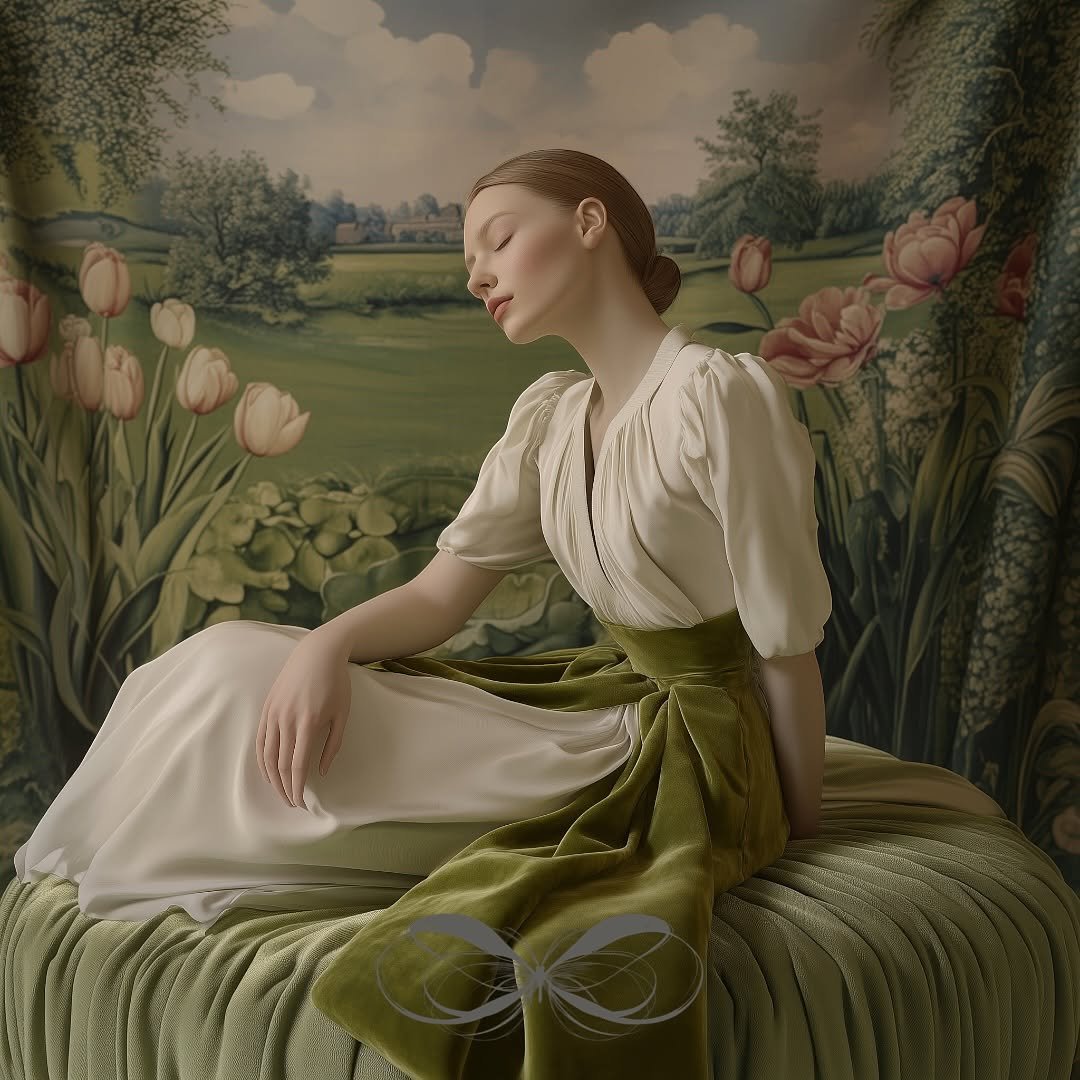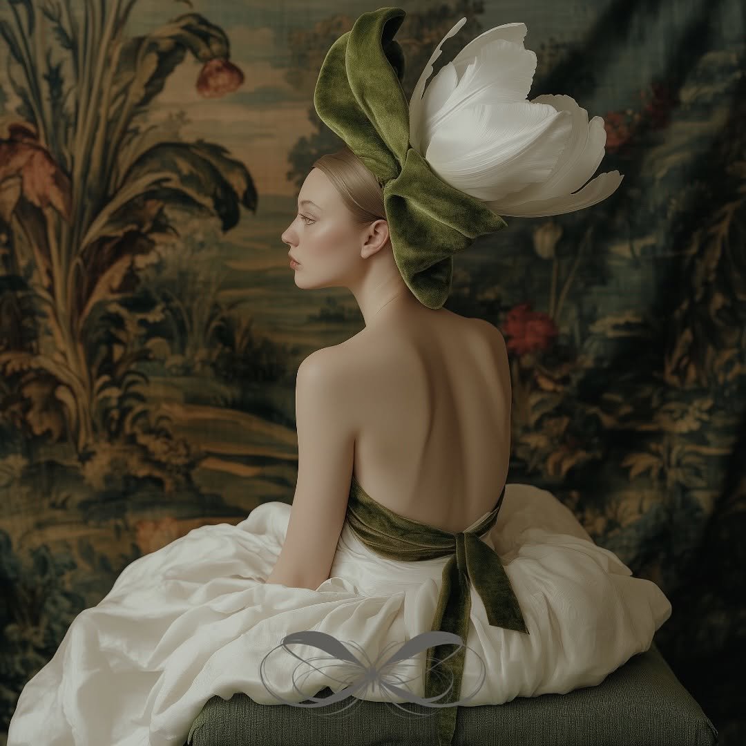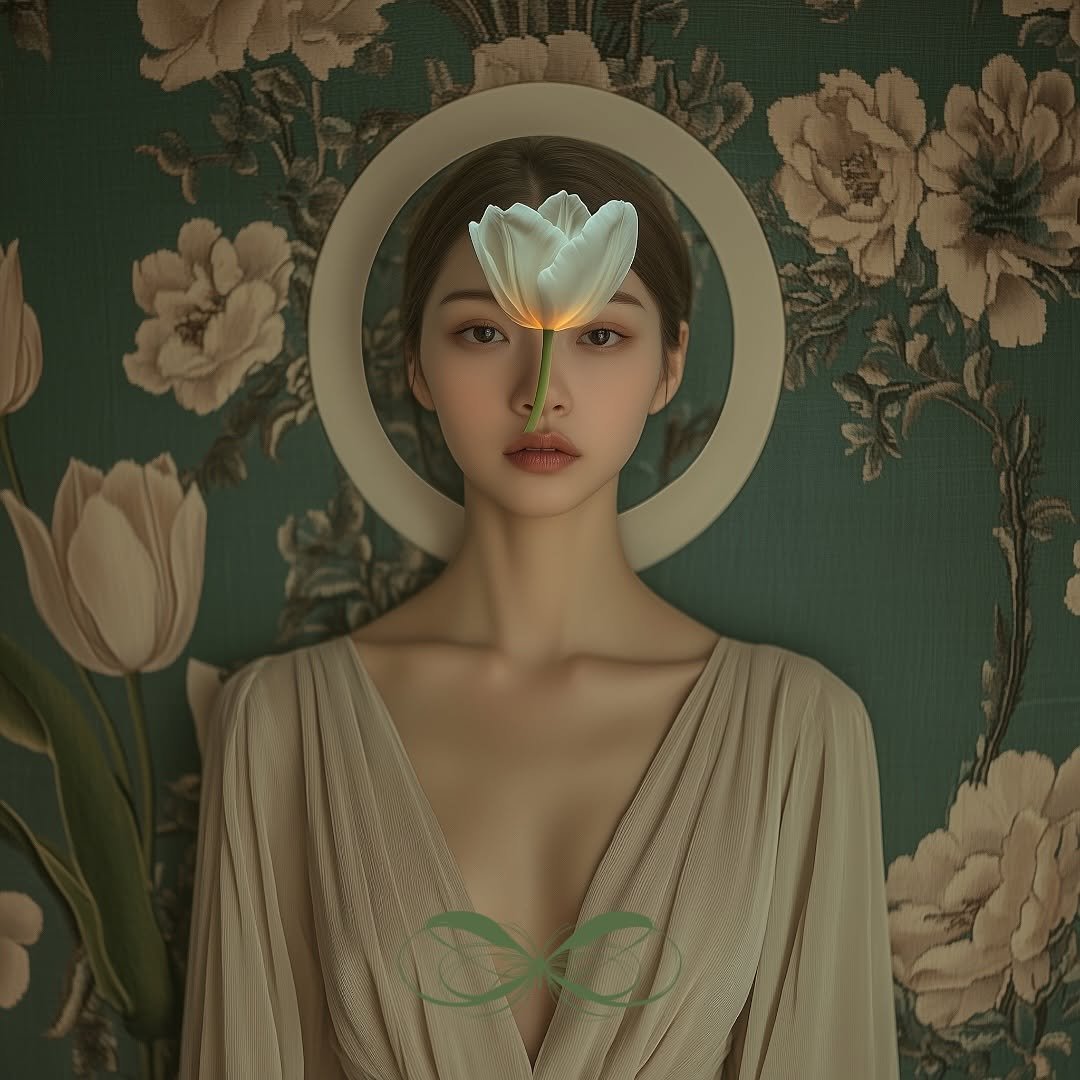 In this series of r. gramm.ai’s work, delicate elements like draped fabrics, floral headgear, and an abundance of spring tulips, in soft tea greens, fern, and cream tones, frame elegant portraits. One figure is seated in front of a woven tapestry, surrounded by intricate greenery. Tapestries were common in the castles and churches of the late medieval and Renaissance eras, and this series evokes a nostalgic, classical art quality. The tulips woven into the headgear integrate nature’s simplicity, combining quiet beauty with balanced, timeless compositions.