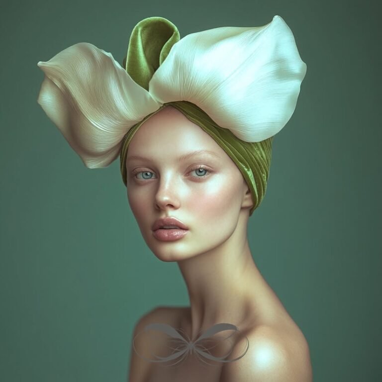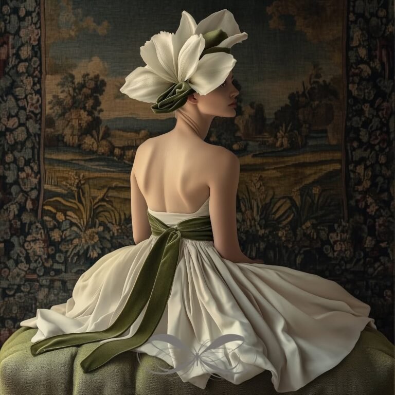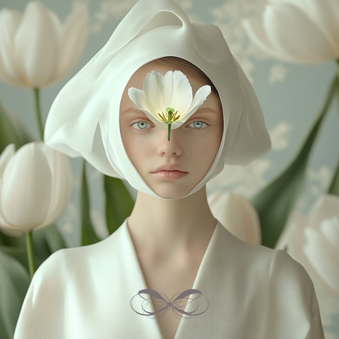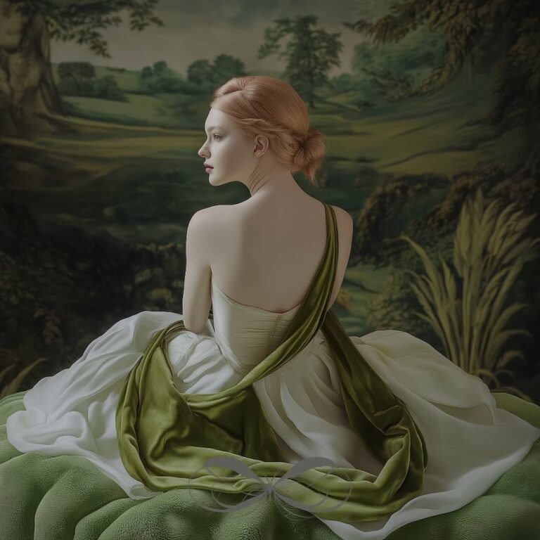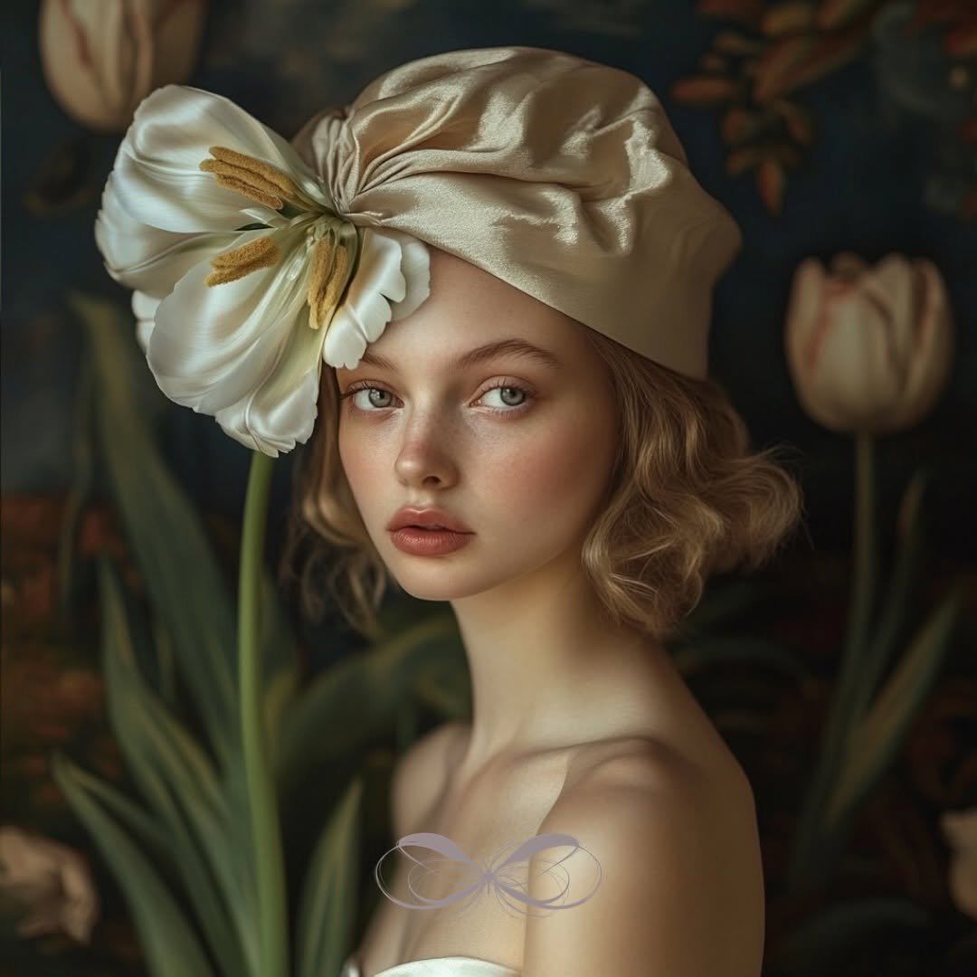 In this series of r. gramm.ai’s work, delicate elements like draped fabrics, floral headgear, and an abundance of spring tulips, in soft tea greens, fern, and cream tones, frame elegant portraits. One figure is seated in front of a woven tapestry, surrounded by intricate greenery. Tapestries were common in the castles and churches of the late medieval and Renaissance eras, and this series evokes a nostalgic, classical art quality. The tulips woven into the headgear integrate nature’s simplicity, combining quiet beauty with balanced, timeless compositions.