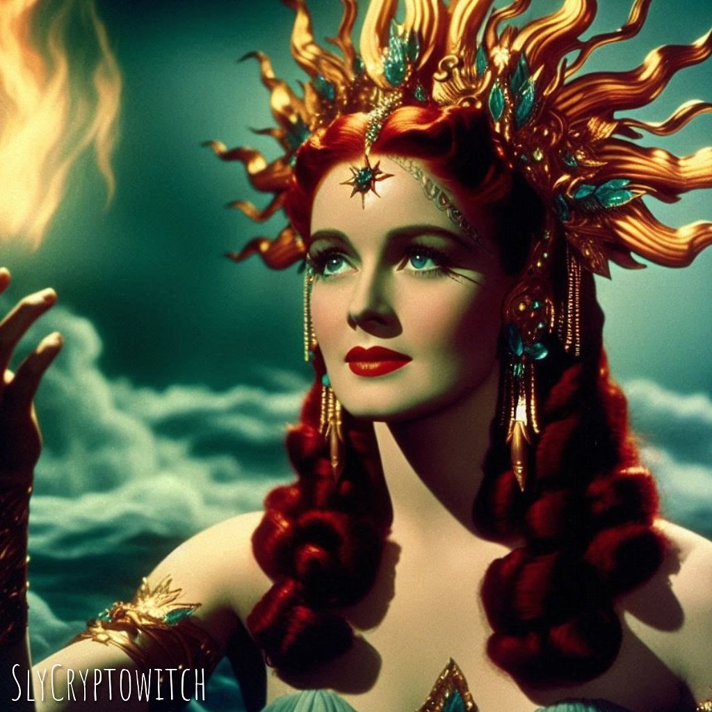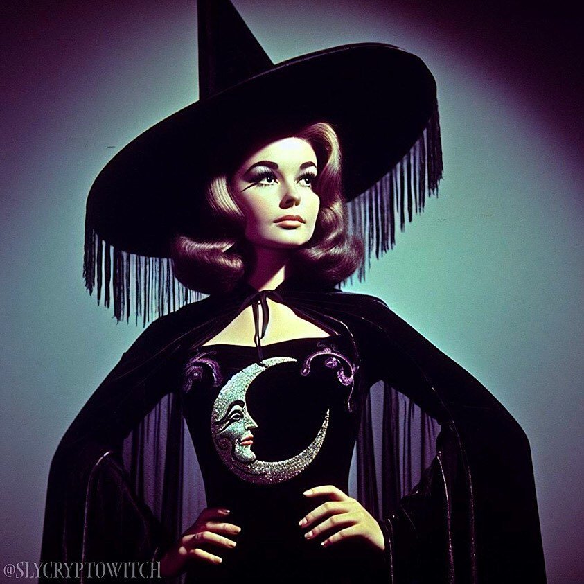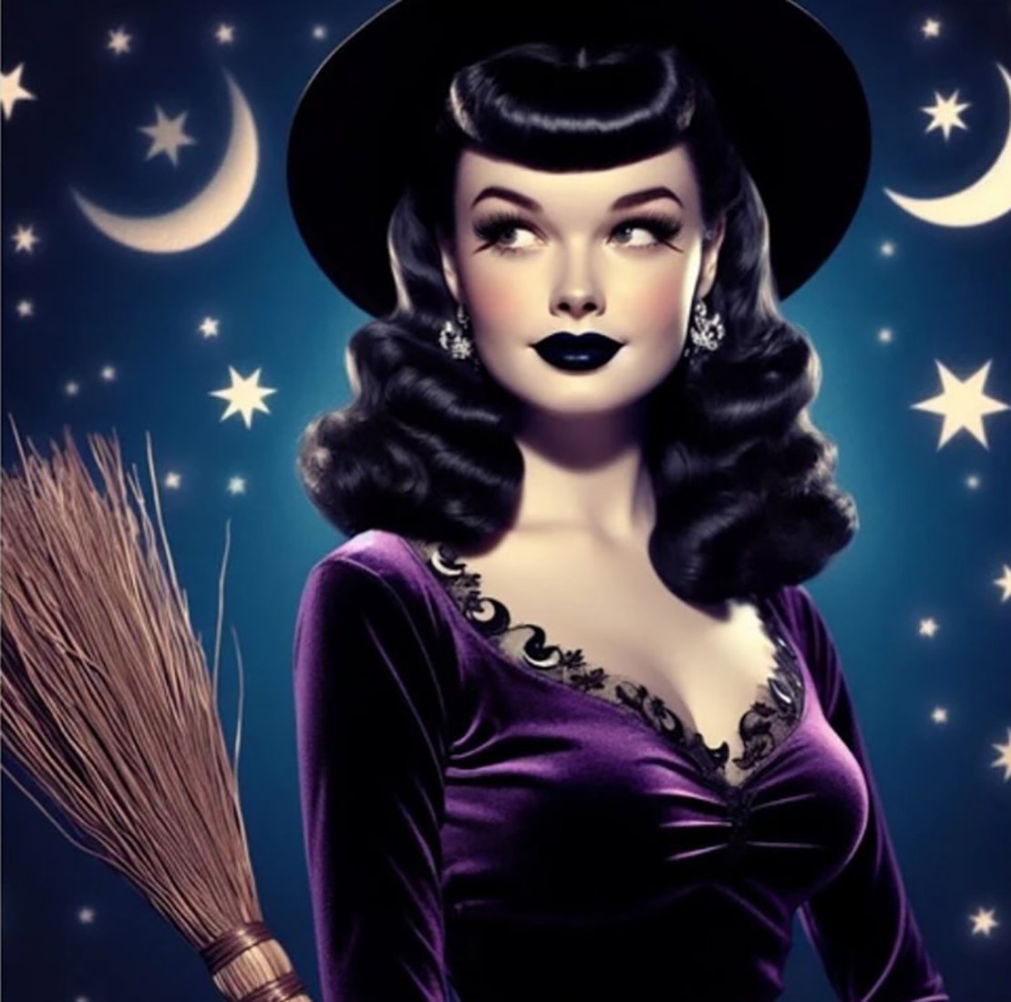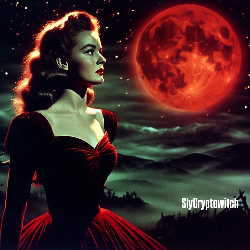 @SlyCryptowitch‘s fascination lies in the moon—and in the moods of midnight cinema. Drawing from 1960s pop culture and retro witchcraft aesthetics, her work is pure spectacle: glamorous witches, crimson skies, and eerie moons that feel lifted from B-movie lore. Unlike the other artists’ quiet reverence or folk mysticism, hers is knowingly theatrical—where the cosmos becomes a stage for fantasy, fear, and feminine myth.